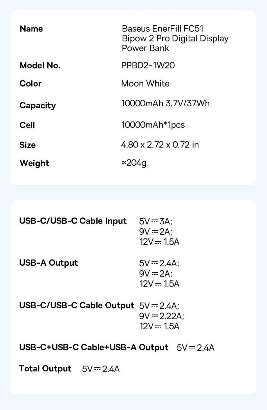 Особенности внешнего аккумулятора Baseus EnerFill FC51 Bipow2 Pro 22.5W (10000mAh) + кабель Type-C  (E0027600):