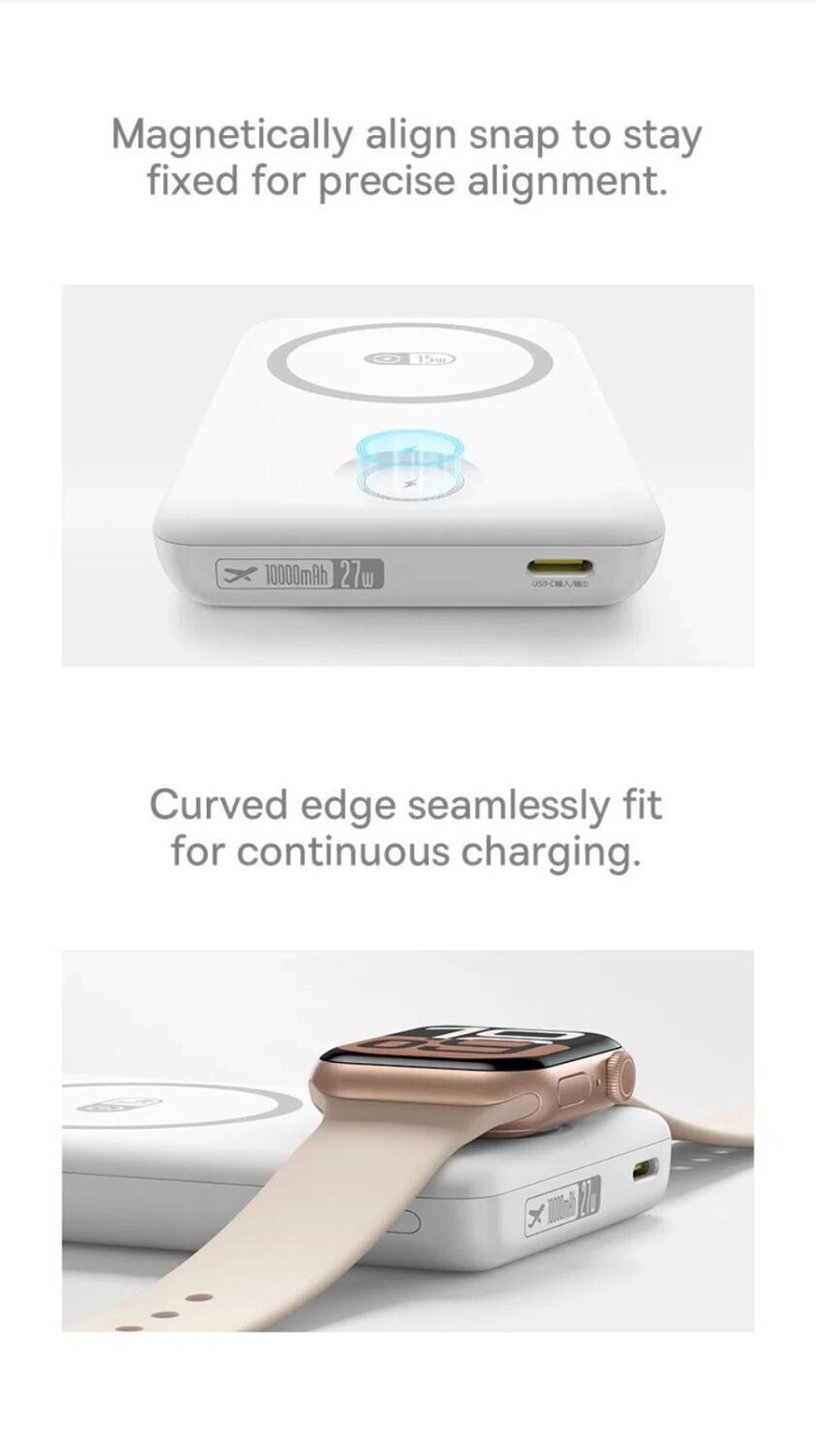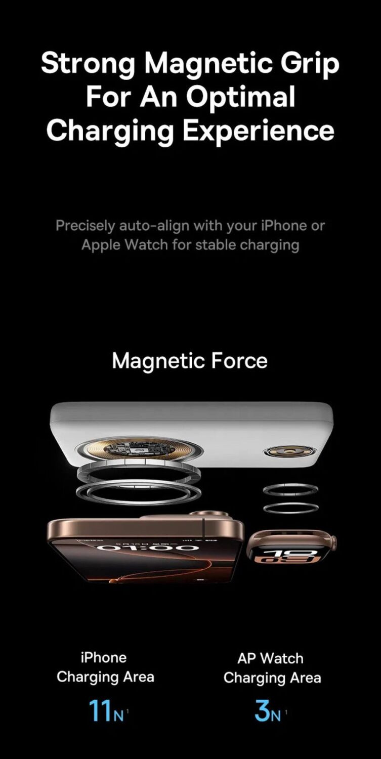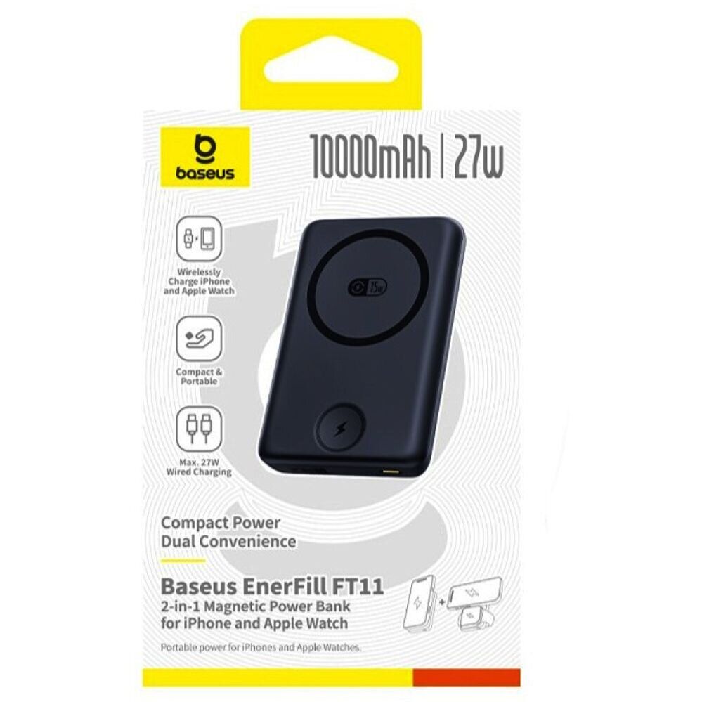 Внешний аккумулятор Baseus EnerFill FT11 Magnetic 27W (10000mAh) — компактный магнитный пауэрбанк формата «2-в-1», созданный для экосистемы Apple: он фиксируется на iPhone с точным позиционированием и одновременно может заряжать iPhone и Apple Watch. Ёмкости 10000 мАч хватает, чтобы поддерживать смартфон в течение дня, а беспроводная зарядка MagSafe-совместимого типа избавляет от проводов в дороге, офисе или путешествии. Для iPhone предусмотрена быстрая магнитная беспроводная зарядка до 15 Вт, а для часов — отдельный канал на 2,5 Вт, что удобно в сценарии «телефон + часы» без поиска розетки. Чтобы зарядка оставалась стабильной, реализована усиленная магнитная система, а для контроля нагрева заявлены многослойное охлаждение с современными материалами и частый мониторинг температуры — это помогает поддерживать безопасный режим при длительном использовании. Пауэрбанк выполнен в тонком корпусе с плавными линиями, имеет световую индикацию уровня заряда и комплектуется кабелем USB-C для подзарядки самого устройства.