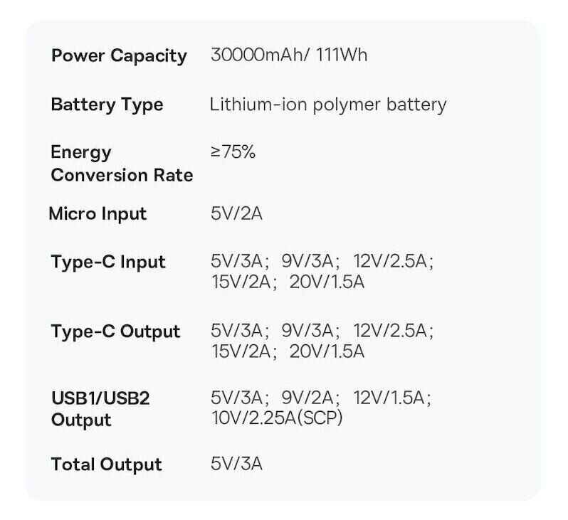 - Большая ёмкость 30 000 мАч обеспечивает до 6 зарядок смартфона или несколько зарядок планшета;