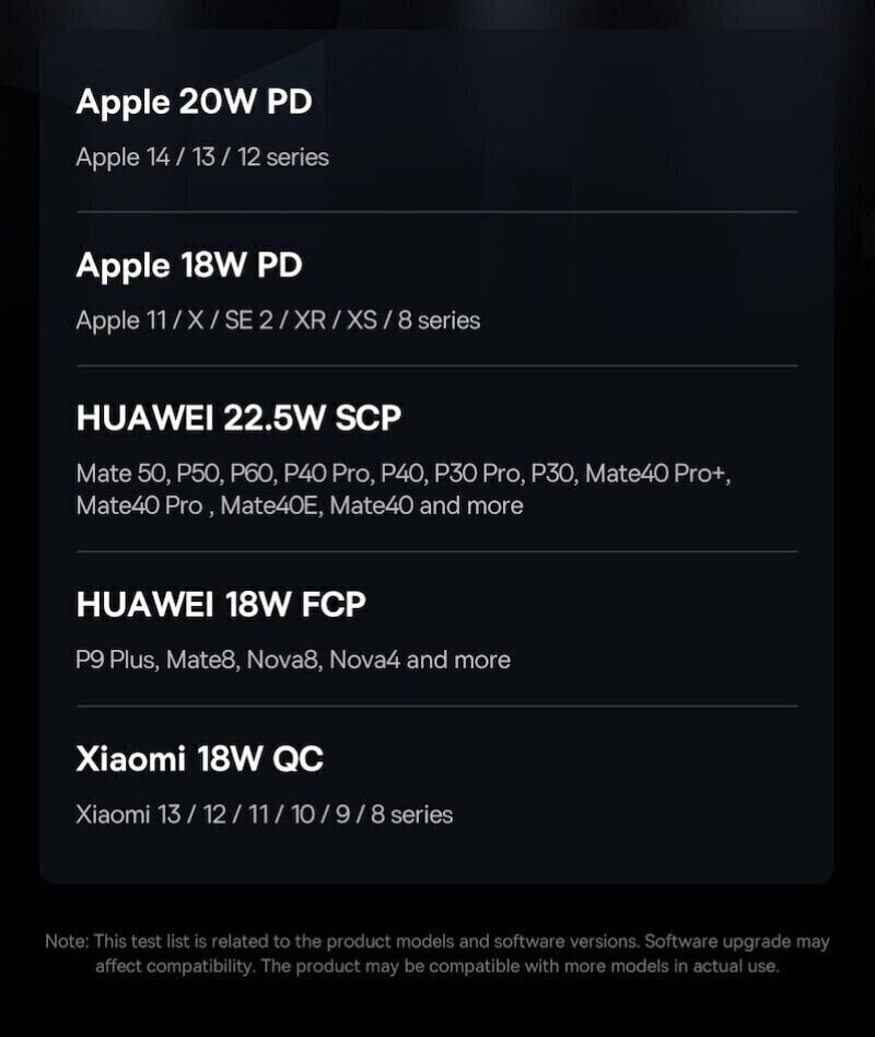 - Совместимость с протоколами QC 3.0, PD, FCP, SCP и AFC гарантирует эффективную и безопасную зарядку;