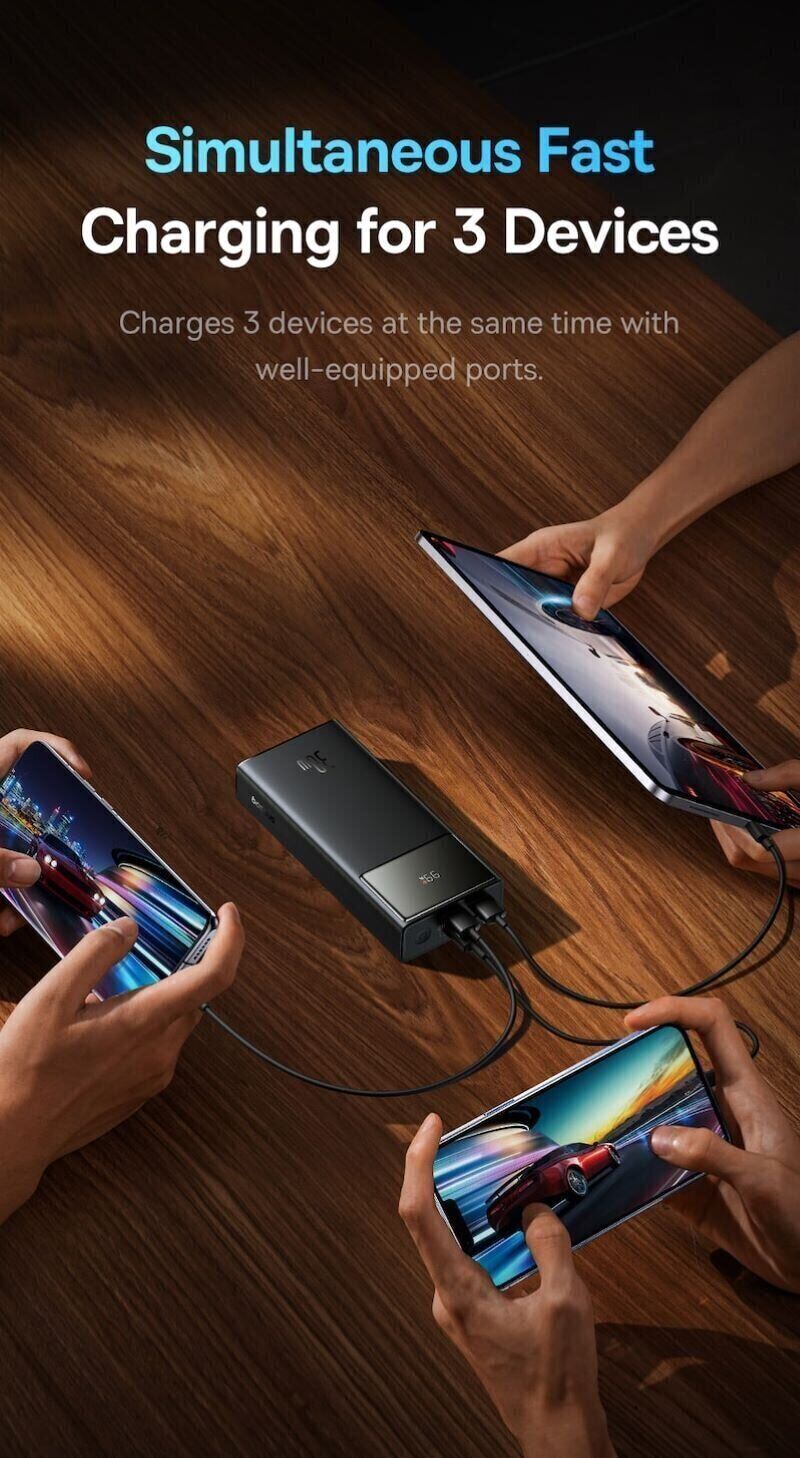 - Три выходных порта — два USB-A и один USB Type-C — позволяют одновременно питать несколько гаджетов;