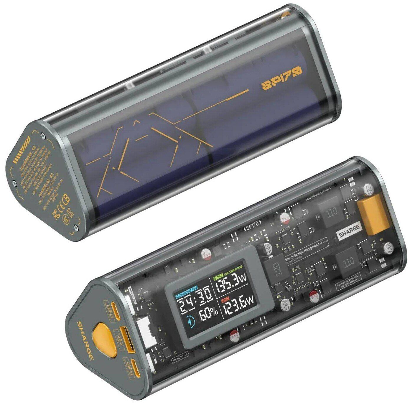 Внешний аккумулятор Sharge Shargeek 170 170W (24000mAh) – это портативный источник питания с высокой выходной мощностью, предназначенный для зарядки смартфонов, планшетов и другой электроники. Емкость 24000 мАч позволяет восполнять заряд нескольких устройств, снижая необходимость частого подключения к сети. Поддержка мощности до 170 Вт обеспечивает возможность работы с энергоемкими гаджетами, включая современные ультрабуки и другие устройства с высоким потреблением энергии. Корпус выполнен из прочного пластика с прозрачными элементами, через которые видна внутренняя архитектура, что подчеркивает технический характер устройства и облегчает визуальный контроль компонентов. На корпусе предусмотрен дисплей, отображающий уровень заряда, текущую мощность и параметры работы, что позволяет отслеживать процесс в реальном времени. Наличие нескольких портов дает возможность одновременно подключать разные устройства, при этом распределение энергии происходит с учетом их потребностей. Встроенные электронные компоненты отвечают за стабильную подачу питания и корректную работу с подключенной техникой. Габариты оптимизированы для переноски в рюкзаке или сумке, что делает аккумулятор удобным решением для поездок и работы вне стационарных условий. Устройство подходит для использования в ситуациях, когда доступ к розетке ограничен или отсутствует.