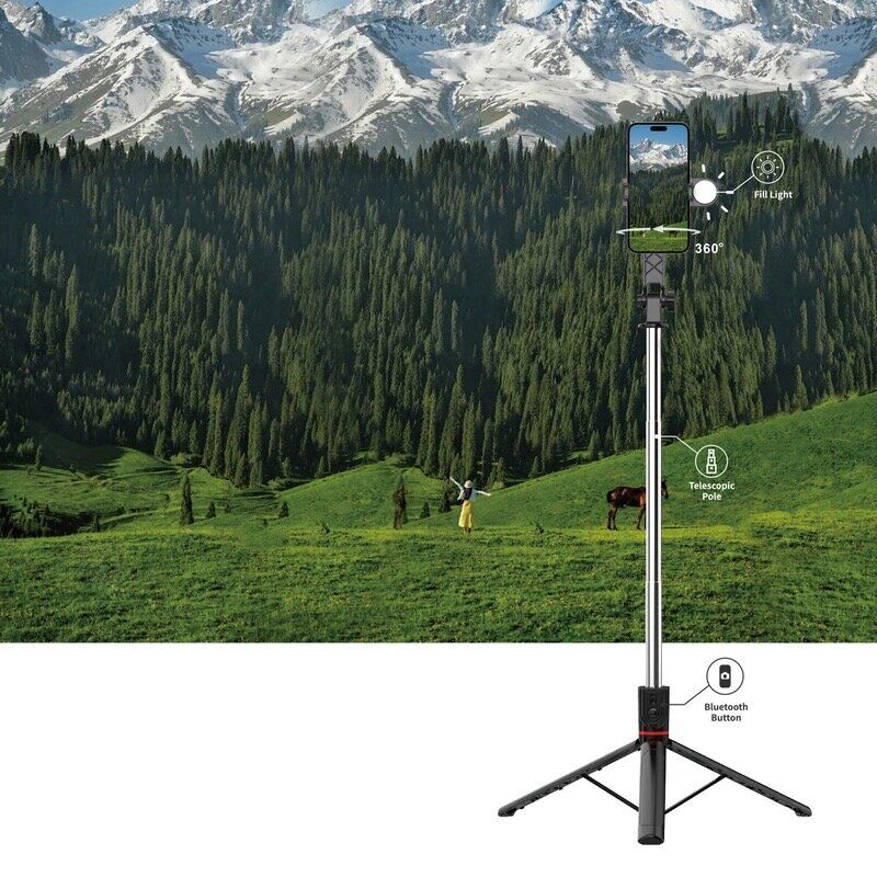 Монопод WIWU Wi-SE015 — это универсальный гаджет 2-в-1, который объединяет селфи-палку и полноценный штатив, помогая снимать контент профессиональнее в любых условиях. Телескопическая конструкция выдвигается до 1,8 м, поэтому удобно делать кадры в полный рост, групповые фото и видео без лишних усилий. Поворот на 360° и возможность съемки как в вертикальном, так и в горизонтальном формате позволяют быстро менять ракурс для сторис, влогов, прямых эфиров и съемок на природе. Усиленное основание штатива с утолщёнными опорами обеспечивает уверенную устойчивость. Встроенная LED-подсветка с Bluetooth-управлением добавляет свет и делает лицо более выразительным в помещении или вечером, а съёмный Bluetooth-пульт позволяет запускать фото и видео на расстоянии. При этом монопод легко складывается, занимает минимум места и быстро трансформируется в держатель телефона — идеальный вариант для путешествий и повседневной съемки.