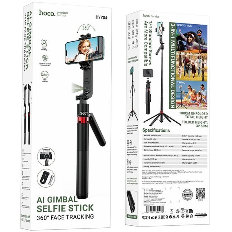 Селфи-монопод Hoco DYY04 + пульт — это многофункциональное устройство, сочетающее возможности стабилизатора, селфи-палки и интеллектуальной системы съёмки. Модель оснащена встроенным гиростабилизатором, который обеспечивает плавное видео без дрожания, делая её отличным выбором для создания контента, стриминга и видеосъёмки. Устройство поддерживает управление жестами и интеллектуальное отслеживание объекта благодаря технологии AI, что позволяет автоматически удерживать пользователя в кадре. Конструкция выполнена из прочного алюминиевого сплава и ABS, обеспечивая надёжность и долговечность. Встроенный аккумулятор ёмкостью 1500 мАч обеспечивает до 3,5 часов работы, а съёмный пульт дистанционного управления добавляет удобства при съёмке. Монопод совместим со смартфонами с диагональю от 4,5 до 7,2 дюйма и легко адаптируется под различные сценарии использования.