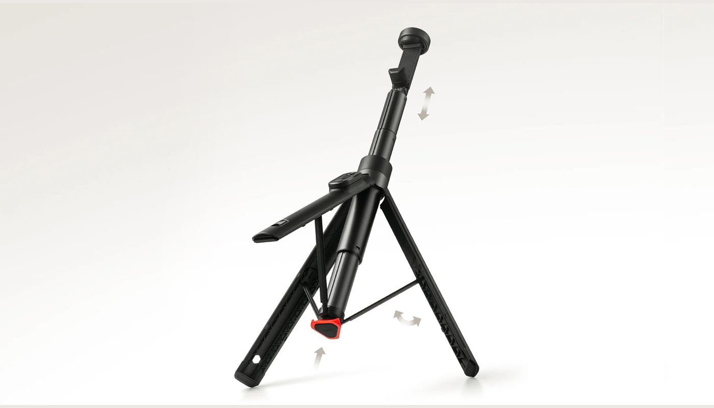 Модель отличается длинными ножками штатива с нескользящим основанием, которые обеспечивают уверенную устойчивость даже на плитке, асфальте или неровных поверхностях. Внутри использован цинковый сплав, который усиливает конструкцию и уменьшает риск раскачивания во время съемки. Дополнительным преимуществом является складной дизайн с раскрытием одним нажатием — монопод мгновенно переходит из компактного формата в полноценный штатив, что особенно удобно в дороге или во время быстрых сюжетов.