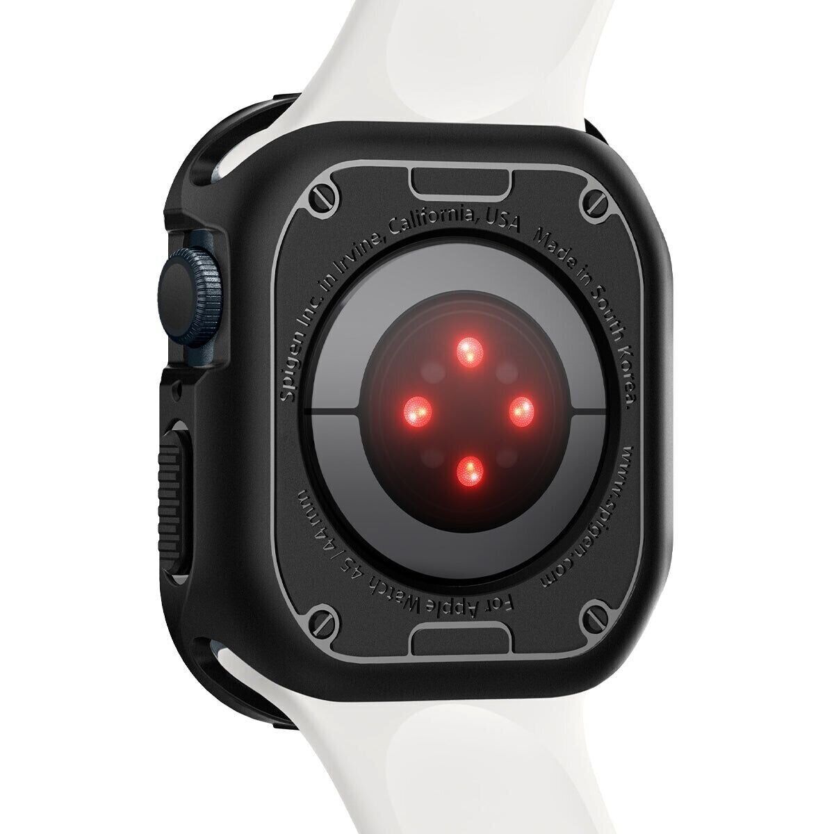 Защитный чехол Spigen (SGP) Rugged Armor (FW) для Apple Watch 44 / SE 44 mm создан для того, чтобы защитить корпус умных часов от царапин и потертостей. Каждая деталь продумана до последней мелочи, поэтому чехол идеально садится на корпус, не ограничивает функционал часов, дополнительно защищает экран за счет приподнятых рамок. Преображает внешний вид часов, добавляя ему более грубые очертания.
