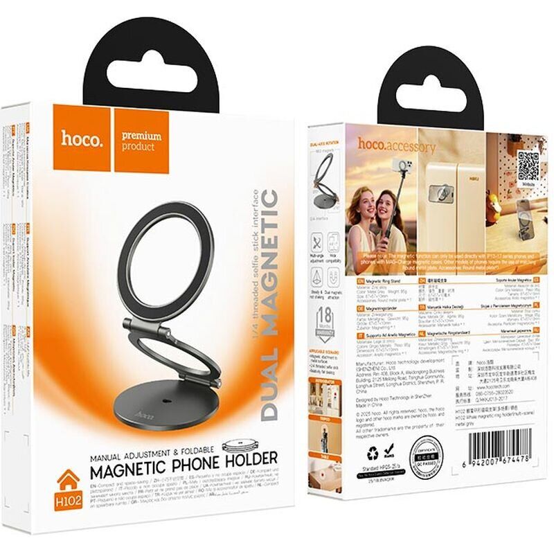 Магнитный держатель Hoco H102 — это универсальный аксессуар для удобного размещения смартфона в различных условиях, будь то дома, в офисе или во время съёмки контента. Модель выполнена из прочного цинкового сплава с применением технологии электроплатирования, что придаёт устройству стильный внешний вид и повышает устойчивость к износу. Магнитная система обеспечивает надёжную фиксацию смартфона, позволяя использовать его на столе, кухне, в ванной комнате или закреплять на селфи-моноподе благодаря стандартному резьбовому креплению 1/4. Складная конструкция делает держатель компактным и удобным для хранения и транспортировки. Устройство совместимо со смартфонами диагональю от 4.5 до 7.0 дюймов, обеспечивая стабильность и комфорт в повседневном использовании.