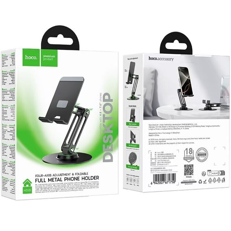 Универсальная подставка Hoco HD15 - это практичное решение для комфортного использования смартфона дома и в офисе. Компактная и продуманная конструкция позволяет легко разместить устройство на столе, освободив руки для работы, общения или просмотра контента. Благодаря складному механизму держатель удобно брать с собой или хранить, не занимая лишнего места. Надежное основание и качественные материалы обеспечивают устойчивость даже при активном использовании. Подставка поддерживает широкий диапазон диагоналей, а трехосевая регулировка и плавное вращение дают возможность выбрать оптимальный угол обзора. Поверхность предотвращает скольжение и защищает корпус устройства от повреждений, а эффективное рассеивание тепла помогает избежать перегрева при длительной работе.