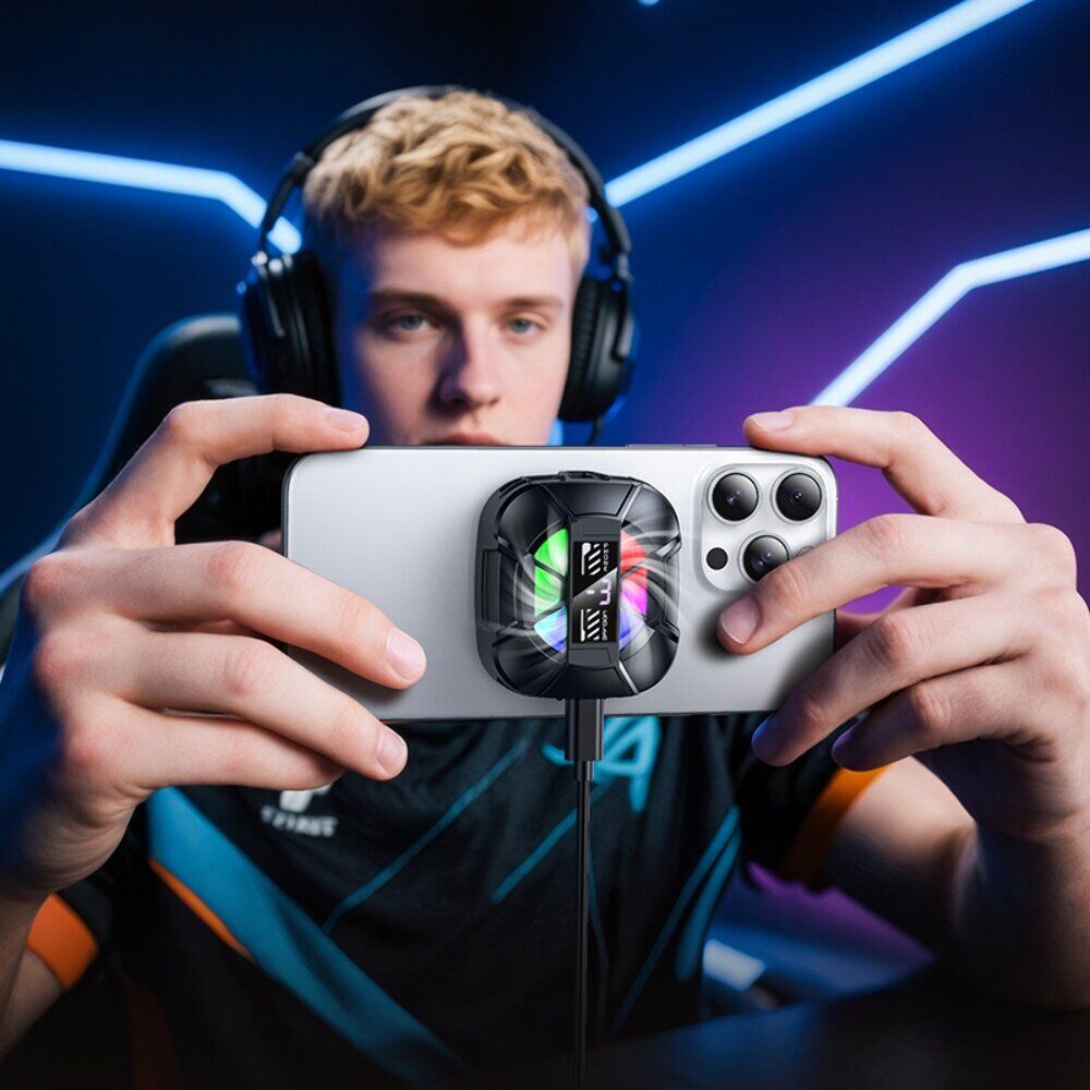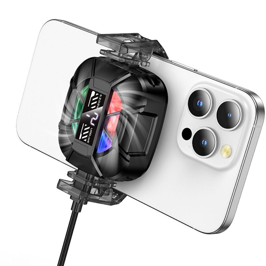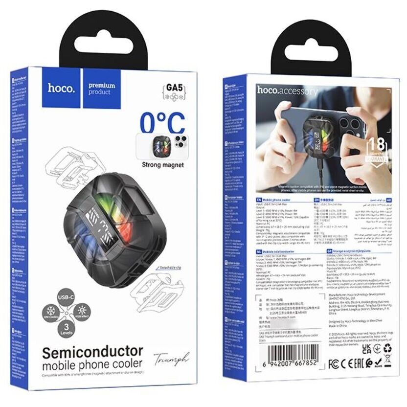 Кулер-вентилятор для смартфона Hoco GA5 — компактное охлаждение для тех случаев, когда телефон нагревается под нагрузкой: в играх, во время стриминга, видеозвонков или длительной съемки. Модель подключается через Type-C и обеспечивает стабильную работу, помогая быстро отводить тепло и снижать вероятность троттлинга. Крепление продумано под разные сценарии: можно использовать магнитную пластину для быстрого монтажа или надежный зажим для смартфонов шириной 65 - 95 мм. Внутри установлен мощный вентилятор с 7 лопастями и скоростью до 5300 об/мин, при этом акцент сделан на тихую работу, чтобы не мешать общению и записи звука. Три режима охлаждения позволяют подобрать интенсивность под текущую задачу, а цифровой дисплей дает наглядный контроль температуры в реальном времени. Для визуального эффекта предусмотрена RGB-подсветка, а небольшой вес 70 г делает аксессуар удобным для переноски и использования «на ходу».