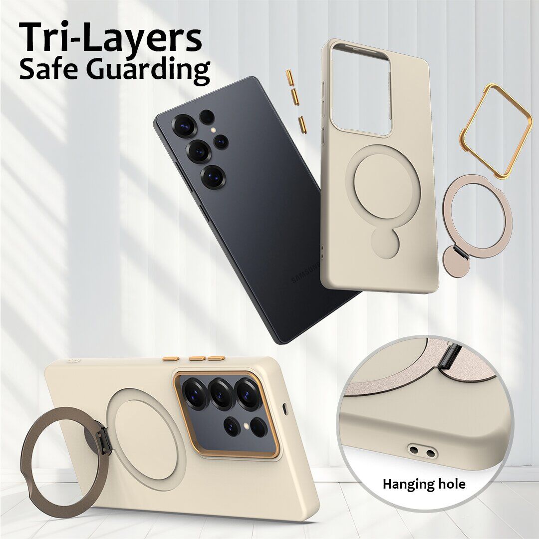 Защитный чехол Reframe Draco Case разработан с учётом геометрии корпуса Samsung Galaxy S24 Ultra (S928) и особенностей его эксплуатации. Основа аксессуара выполнена из комбинации TPU и PC, образующей многослойную конструкцию, которая способствует более равномерному распределению нагрузки при ударах и снижает риск повреждений при падениях. Внутренняя поверхность дополнена мягкой микрофиброй, предназначенной для уменьшения вероятности появления царапин, потёртостей и следов трения на задней панели устройства. Усиленные угловые элементы конструкции помогают смягчать воздействие при контактах с твёрдыми поверхностями. На задней панели предусмотрено металлическое кольцо, которое может использоваться как держатель или подставка для размещения смартфона в вертикальном и горизонтальном положении. Приподнятые края вокруг экрана и блока камер уменьшают вероятность повреждений при размещении устройства на столе или другой ровной поверхности. Встроенная магнитная система обеспечивает совместимость с магнитными зарядными устройствами и автомобильными держателями без необходимости снимать аксессуар.