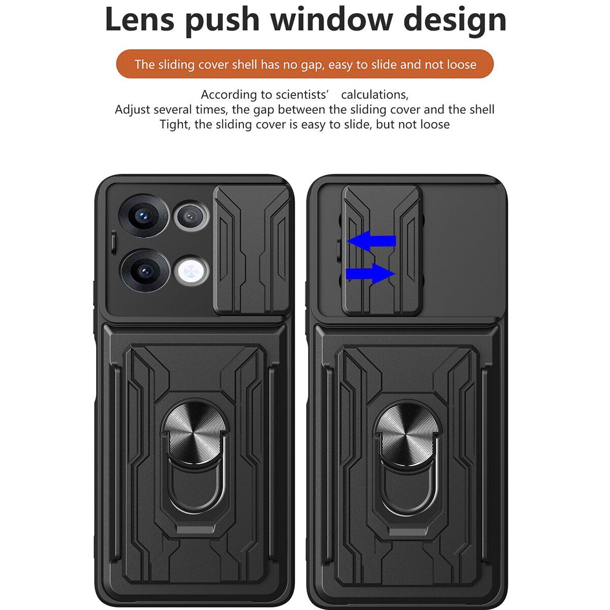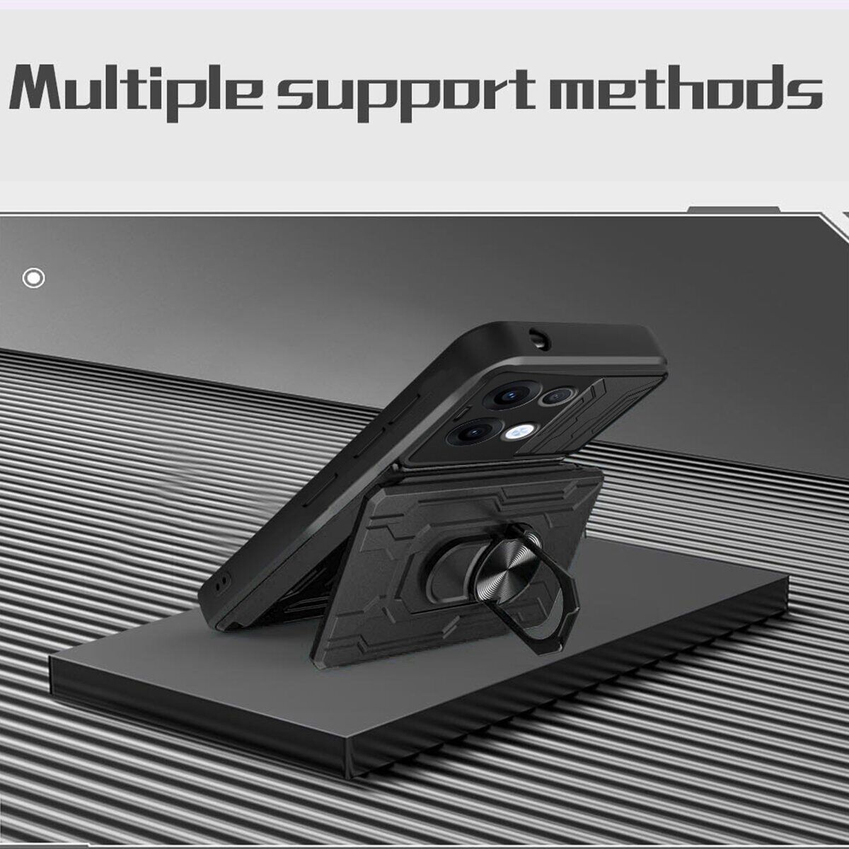 Deexe Armor Slider – это чехол повышенной безопасности, гарантирующий сохранность OPPO Reno 13 5G даже при жестких ударах и падениях на пол. В основе здесь лежит двусоставная компоновка из эластичной силиконовой (TPU) накладки и жесткого поликарбонатного панциря, обеспечивающего "противоударный" эффект. Чехол эффектно выглядит, а его текстурированная поверхность приятна на ощупь и не скользит в ладони. Конструкция учитывает размещение камеры и функциональных разъёмов, для которых предусмотрены вырезы, а также аппаратных клавиш, которые покрываются мягкими дубликаторами. Для защиты камеры предусмотрена специальная подвижная шторка, которая будет прикрывать хрупкий объектив на то время, пока вы в ней не нуждаетесь. Дополнительно на спинке размещён металлический элемент с кольцом-подставкой, позволяющий фиксировать устройство на магнитной панели автомобильного держателя, без необходимости клеить магнитную наклейку, или же, откинув назад, удобно опереть на него смартфон во время просмотра видео или чтения с экрана.
