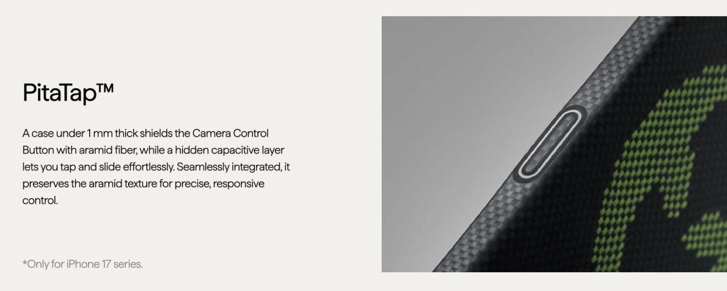 Ультратонкий чехол Pitaka Edge Case Aries для iPhone 17 Pro — минималистичная защита премиум-класса для тех, кто хочет сохранить «ощущение голого телефона», но добавить надежный слой от повседневных царапин и потертостей. Модель создана в коллаборации PITAKA × Aries (Lumintex Edition) и выполнена из арамидного волокна с фирменным плетением: оно дает приятную тактильность, не скользит в руке и выглядит как модный аксессуар. Главная «фишка» версии Lumintex — свечение в темноте после накопления света: узор оживает в сумерках и создает эффект «звездного» мерцания. Чехол совместим с MagSafe и не мешает беспроводной зарядке, а благодаря толщине меньше 1 мм и весу около 20 г практически не утяжеляет iPhone. Отдельно продумана зона Camera Control Button: технология PitaTap использует скрытый емкостный слой, позволяя тапать и скользить по кнопке, сохраняя при этом арамидную фактуру поверхности.