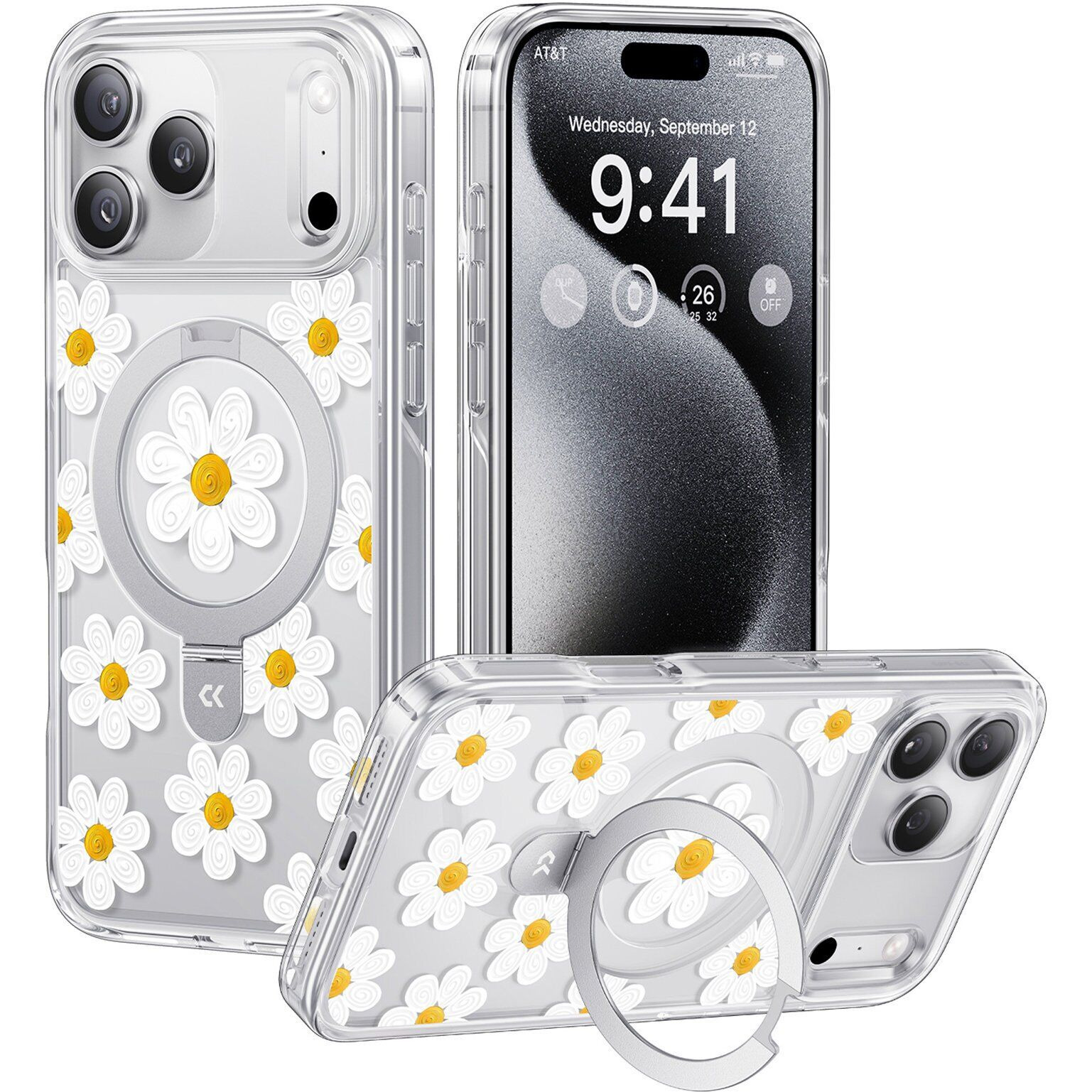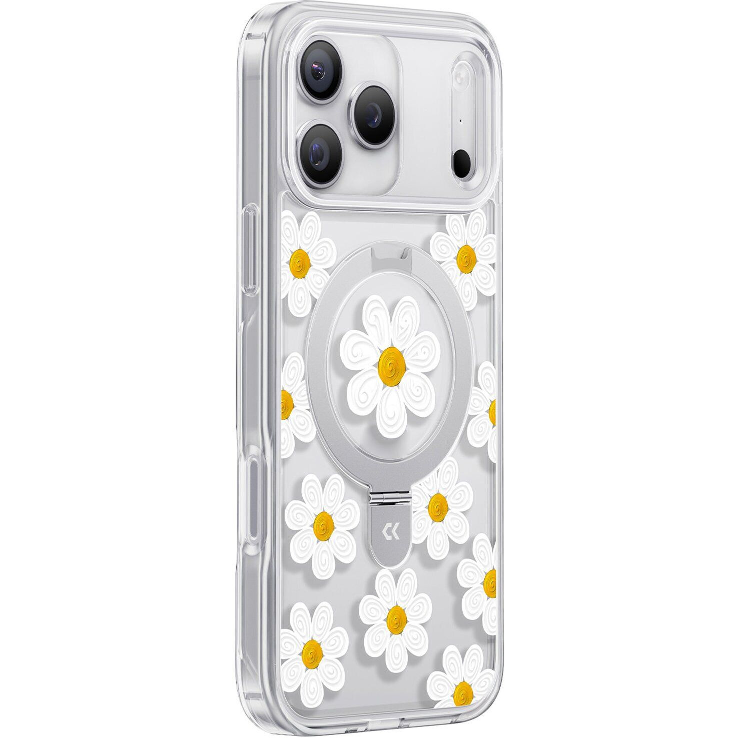 CASEKOO Floral Series для iPhone 17 Pro выполнен в прозрачном формате с декоративным цветочным рисунком, который сохраняет внешний вид устройства и дополняет его визуально. Конструкция сочетает гибкий TPU по периметру и жесткий поликарбонат на задней панели, что упрощает установку и помогает сохранять форму аксессуара со временем. Встроенное магнитное кольцо поддерживает корректную работу с MagSafe-аксессуарами и беспроводной зарядкой без необходимости снимать изделие. Продуманная геометрия корпуса учитывает размеры и расположение элементов смартфона, обеспечивая точную посадку без люфтов. Приподнятые края вокруг экрана и блока камер уменьшают их контакт с поверхностями при размещении устройства. Боковые грани дополнены накладками на кнопки с четким откликом, а все технологические отверстия выполнены аккуратно и не перекрывают функциональные элементы. Дополнительной особенностью является складная подставка с возможностью регулировки угла, которая подходит для просмотра видео, видеосвязи или работы с контентом. Магнитная система рассчитана на стабильную фиксацию с зарядными устройствами и автомобильными держателями, что расширяет сценарии использования.