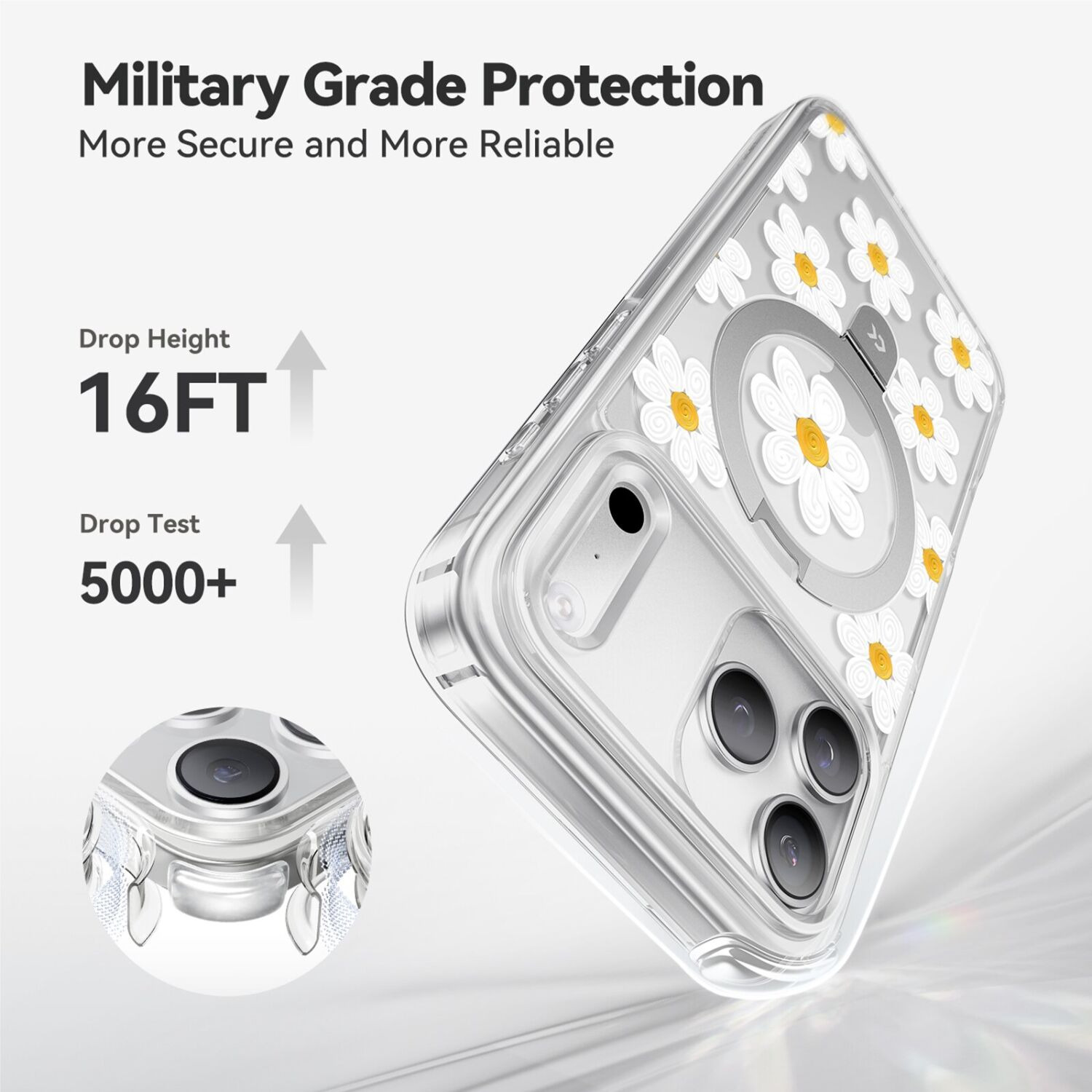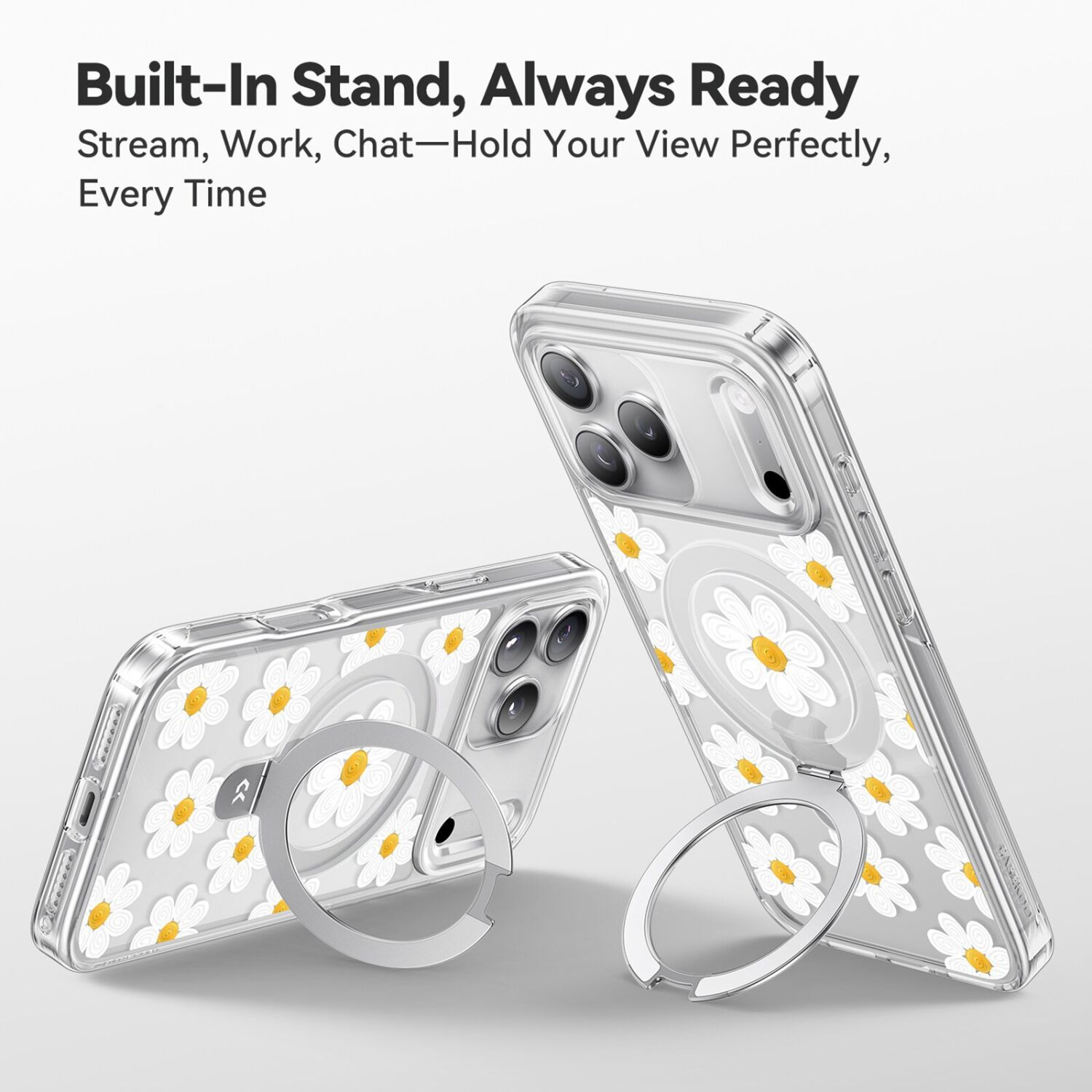 CASEKOO Floral Series для iPhone 17 Pro выполнен в прозрачном формате с декоративным цветочным рисунком, который сохраняет внешний вид устройства и дополняет его визуально. Конструкция сочетает гибкий TPU по периметру и жесткий поликарбонат на задней панели, что упрощает установку и помогает сохранять форму аксессуара со временем. Встроенное магнитное кольцо поддерживает корректную работу с MagSafe-аксессуарами и беспроводной зарядкой без необходимости снимать изделие. Продуманная геометрия корпуса учитывает размеры и расположение элементов смартфона, обеспечивая точную посадку без люфтов. Приподнятые края вокруг экрана и блока камер уменьшают их контакт с поверхностями при размещении устройства. Боковые грани дополнены накладками на кнопки с четким откликом, а все технологические отверстия выполнены аккуратно и не перекрывают функциональные элементы. Дополнительной особенностью является складная подставка с возможностью регулировки угла, которая подходит для просмотра видео, видеосвязи или работы с контентом. Магнитная система рассчитана на стабильную фиксацию с зарядными устройствами и автомобильными держателями, что расширяет сценарии использования.