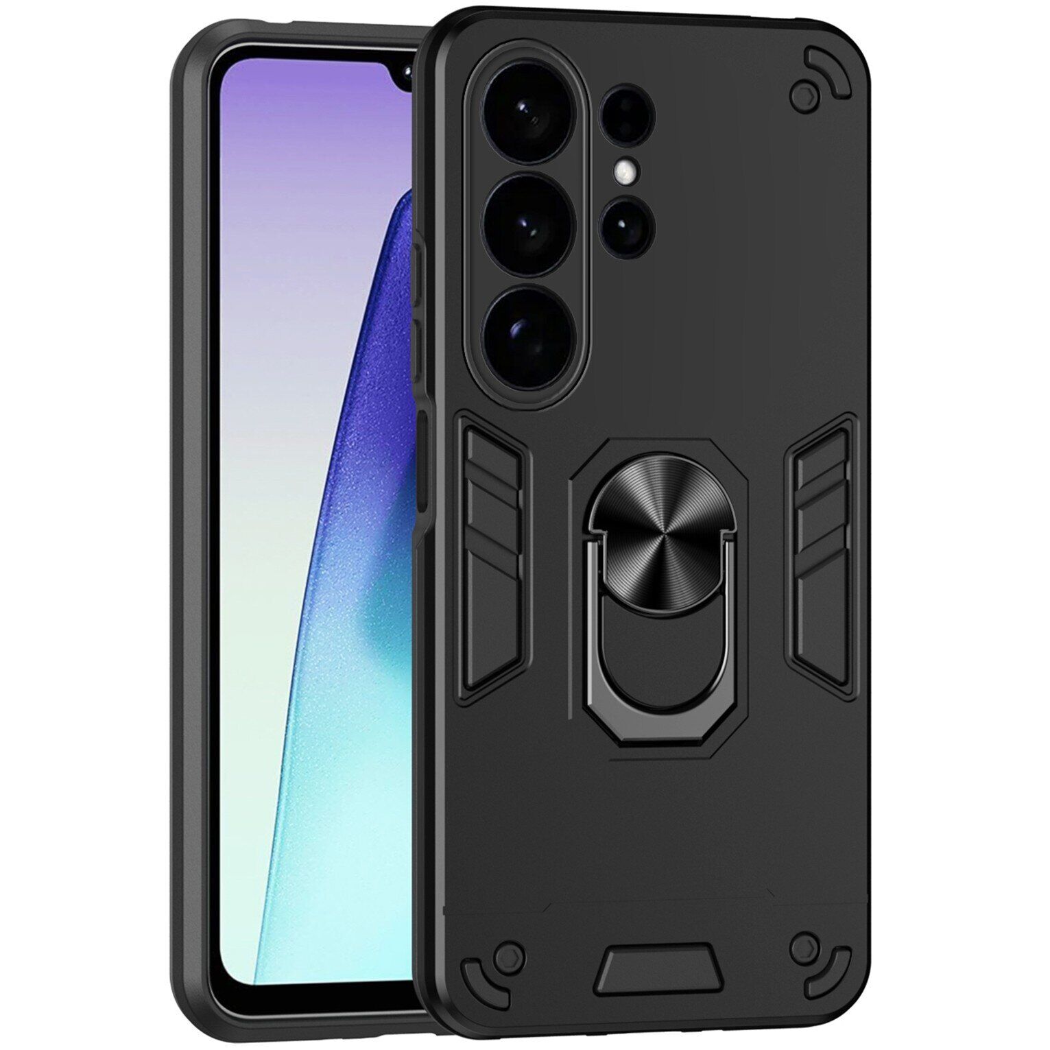 Deexe Hybrid Shell – это чехол с повышенными защитными характеристиками, призванный обеспечить полную сохранность корпуса Samsung Galaxy S26 Ultra в процессе ежедневного использования. В его основе лежит двусоставная компоновка из прочного пластика и эластичного силикона (TPU). Сочетание двух материалов разной жесткости существенно повышает амортизационные характеристики изделия и позволяет без проблем справляться не только с царапинами и потёртостями, но даже трещинами и сколами, смягчая силу удара при падении на пол. Шероховатая фактура внешнего покрытия не собирает на себе отпечатки пальцев, а рифлёные элементы на спинке ещё и повышают ухватистость в руке. Важным элементом конструкции является специальное кольцо на спинке, способное выполнять сразу несколько полезных задач: во-первых, в кольцо можно просунуть палец, чтобы увереннее держать смартфон в руке; во-вторых, откинув кольцо, его можно использовать в качестве удобной подставки; ну и в-третьих, металлический элемент кольца позволяет свободно фиксировать устройство на панели магнитного автомобильного держателя, без необходимости нанесения специальной наклейки.