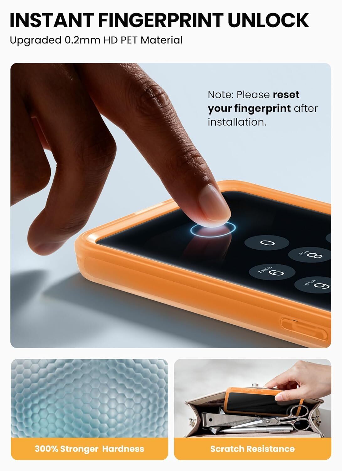 • Примечание: для обеспечения оптимальной работы после установки защитного стекла необходимо заново зарегистрировать отпечаток пальца.