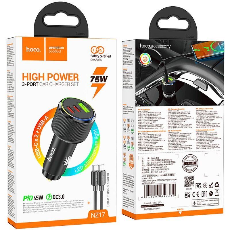 Особенности автомобильного зарядного устройства Hoco NZ17 45W (USB + 2Type-C) + кабель Type-C to Type-C: