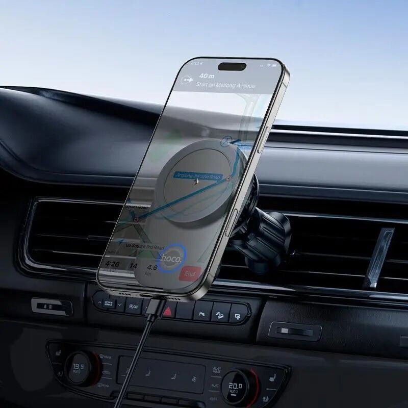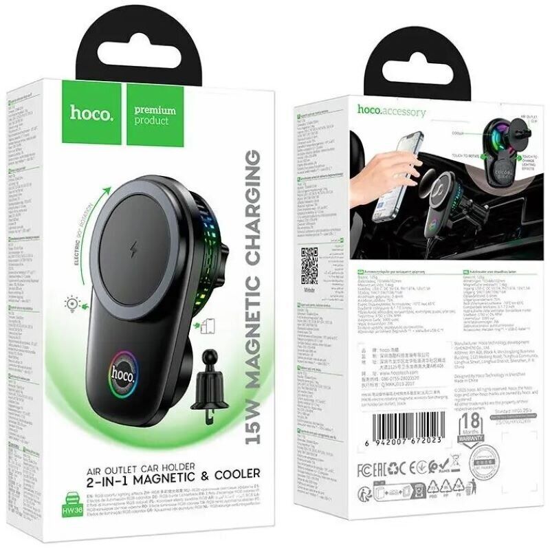 Автомобильный держатель с беспроводной зарядкой Hoco HW36 (15W) Air Outlet - это современное решение для комфортного и безопасного использования смартфона во время поездок. Устройство устанавливается на дефлектор воздуховода с помощью надежного крючкового крепления, обеспечивая стабильную фиксацию даже на неровной дороге. Магнитная система с поддержкой MagSafe позволяет быстро закрепить смартфон и мгновенно начать зарядку без лишних проводов. Мощность до 15 Вт обеспечивает эффективное пополнение заряда, а встроенная система охлаждения предотвращает перегрев при длительном использовании. Электропривод поворота добавляет удобства в настройке угла обзора, а стильная подсветка делает аксессуар не только функциональным, но и эстетически привлекательным элементом салона. Высококачественные материалы гарантируют долговечность и устойчивость к износу.