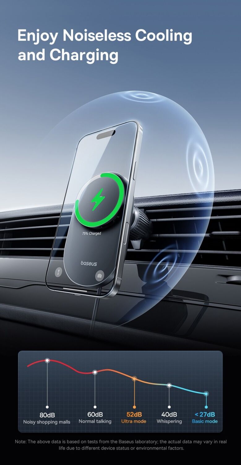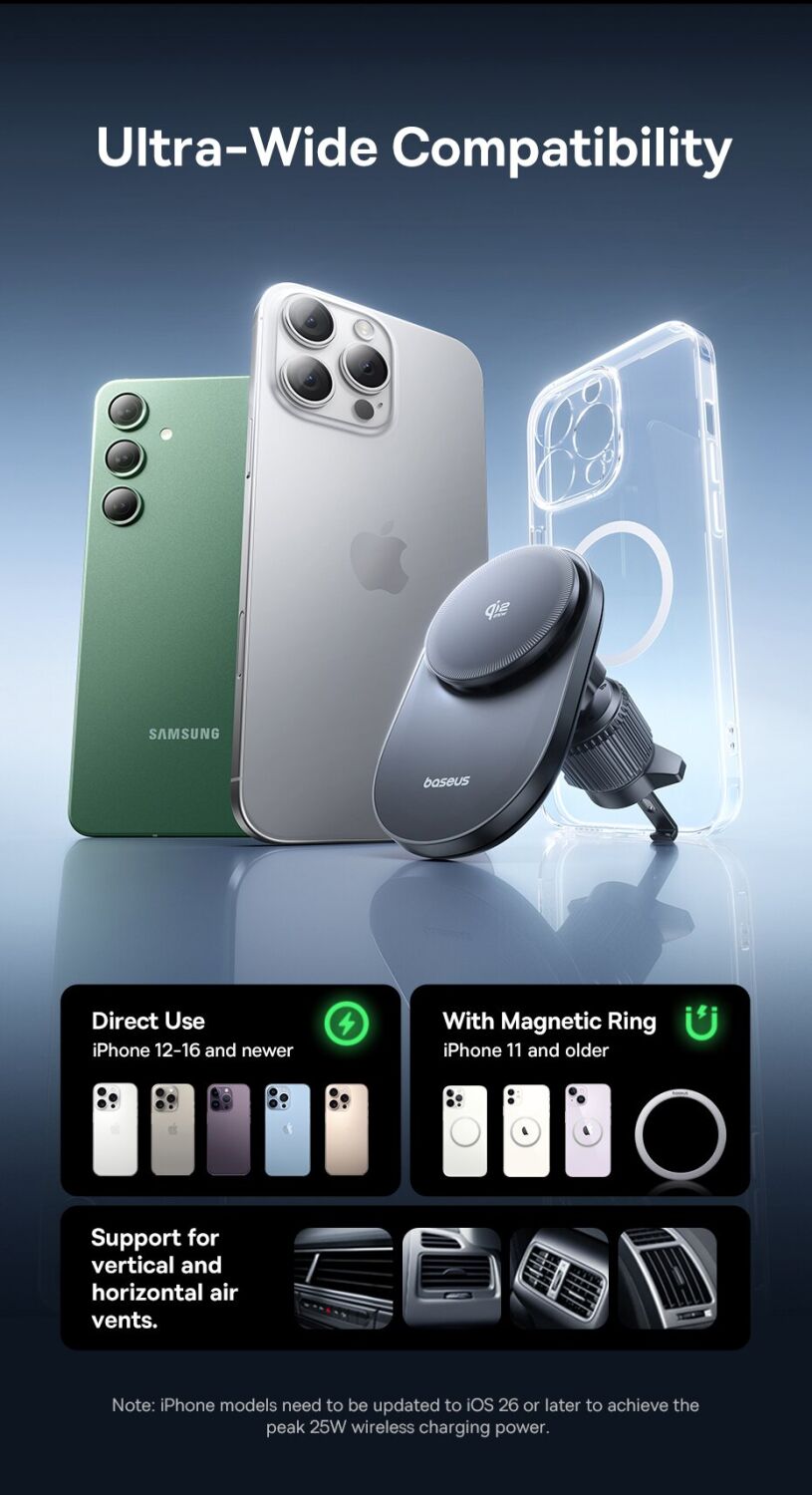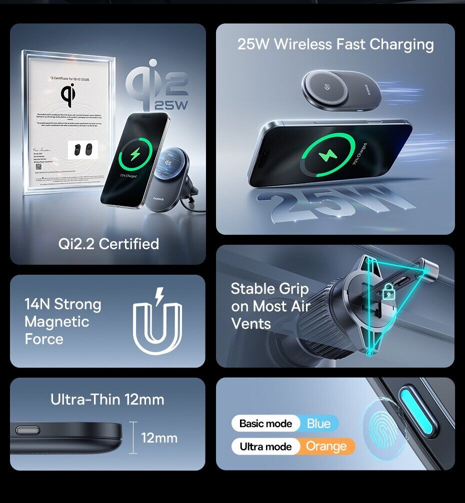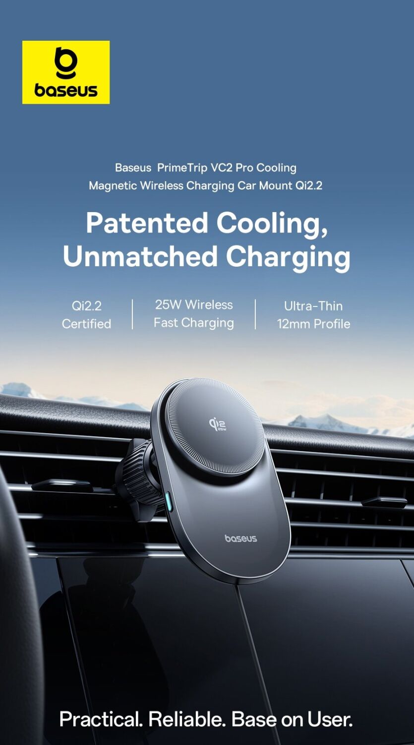 Автомобильный держатель с функцией беспроводной зарядки Baseus PrimeTrip VC2 Pro (C0013N00) — это современное решение для комфортного и безопасного использования смартфона в автомобиле. Устройство сочетает в себе надёжный магнитный держатель и мощную беспроводную зарядку стандарта Qi2 с поддержкой мощности до 25 Вт, обеспечивая быструю и стабильную подзарядку во время поездок. Встроенная система охлаждения с высокоскоростным вентилятором эффективно отводит тепло, поддерживая стабильную производительность и предотвращая перегрев даже при длительном использовании. Мощные магниты с силой притяжения до 14N гарантируют надёжную фиксацию смартфона, а продуманная конструкция крепления на вентиляционную решётку обеспечивает устойчивость без вибраций. Шарнир с вращением на 360° позволяет легко настроить удобный угол обзора, а компактный корпус не занимает лишнего пространства в салоне. Устройство совместимо с широким спектром смартфонов и идеально подходит для ежедневных поездок.