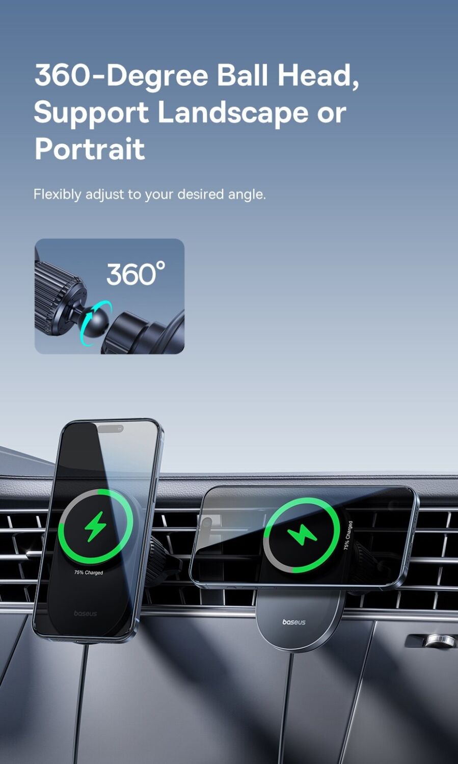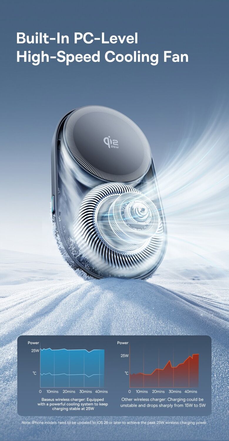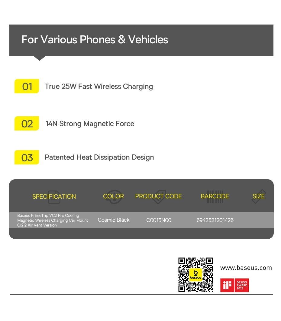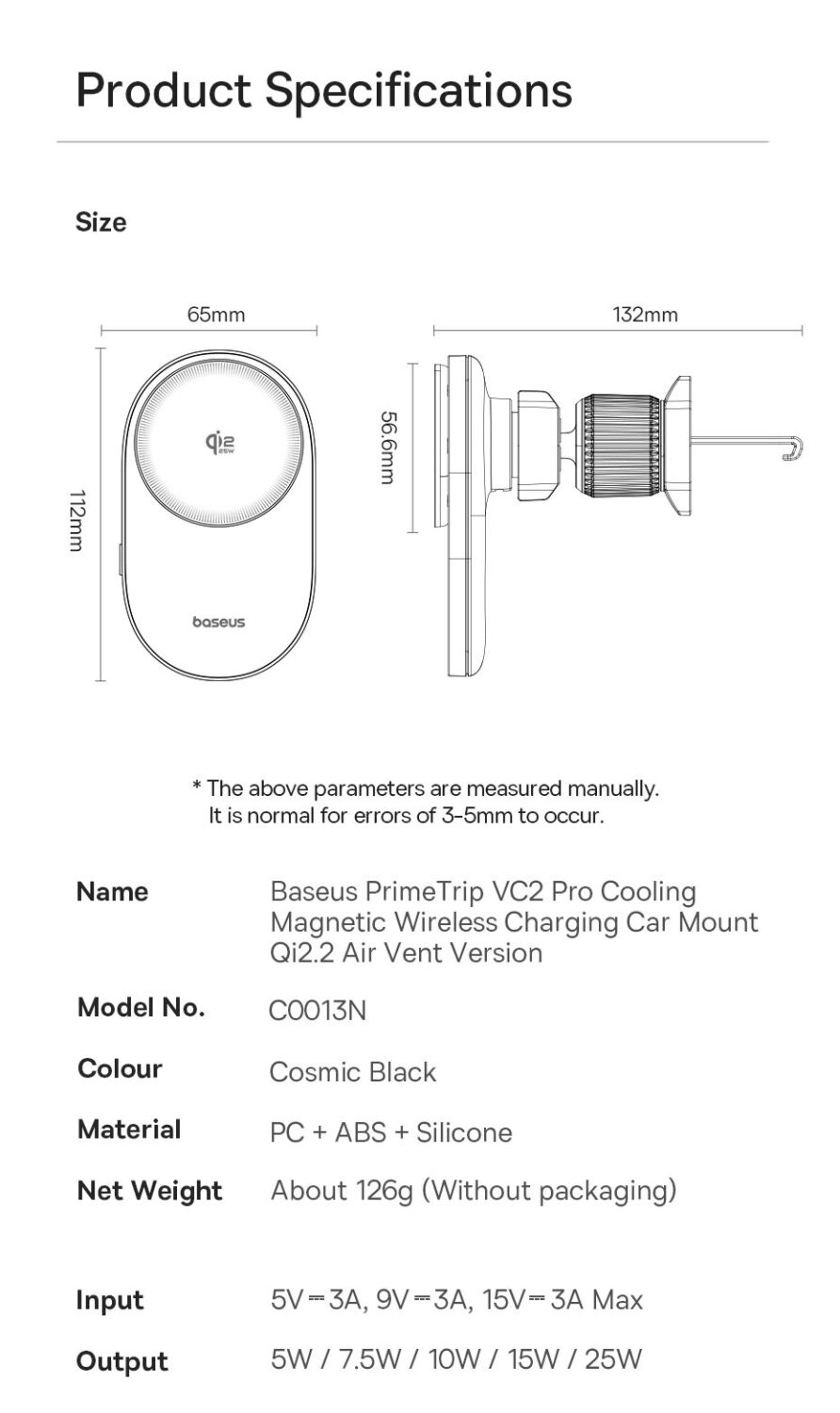 Автомобильный держатель с функцией беспроводной зарядки Baseus PrimeTrip VC2 Pro (C0013N00) — это современное решение для комфортного и безопасного использования смартфона в автомобиле. Устройство сочетает в себе надёжный магнитный держатель и мощную беспроводную зарядку стандарта Qi2 с поддержкой мощности до 25 Вт, обеспечивая быструю и стабильную подзарядку во время поездок. Встроенная система охлаждения с высокоскоростным вентилятором эффективно отводит тепло, поддерживая стабильную производительность и предотвращая перегрев даже при длительном использовании. Мощные магниты с силой притяжения до 14N гарантируют надёжную фиксацию смартфона, а продуманная конструкция крепления на вентиляционную решётку обеспечивает устойчивость без вибраций. Шарнир с вращением на 360° позволяет легко настроить удобный угол обзора, а компактный корпус не занимает лишнего пространства в салоне. Устройство совместимо с широким спектром смартфонов и идеально подходит для ежедневных поездок.