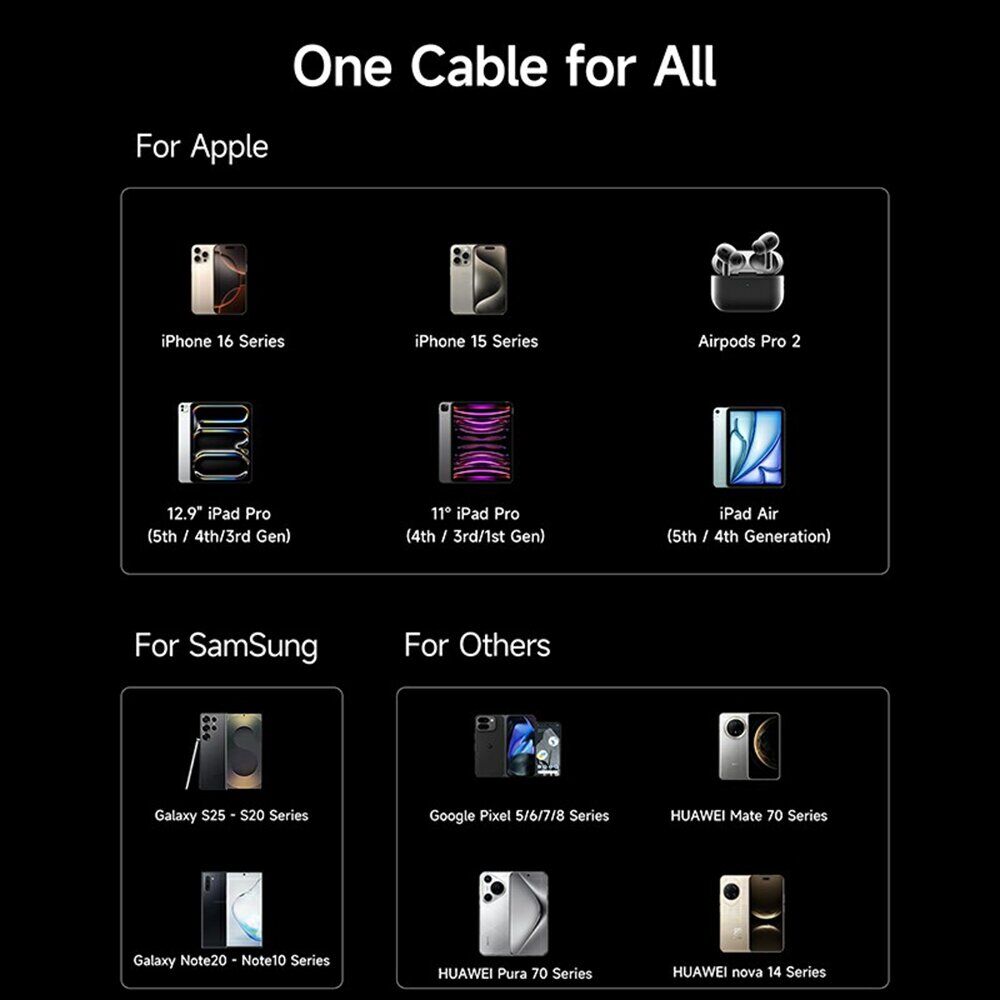 - Поддержка мощности до 100 Вт позволяет использовать кабель с совместимыми смартфонами, планшетами и ноутбуками, обеспечивая быструю подачу энергии при зарядке;