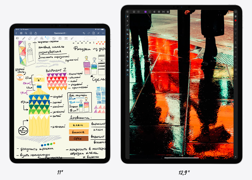Под передним стеклом находится IPS-дисплей с пиксельной плотностью 265 ppi. У iPad Pro 11 она достигается сочетанием 11-дюймовой диагонали и разрешения 2388 х 1668 точек, а в iPad Pro 12.9 это значение стало возможным при использовании 12,9-дюймовой матрицы, отображающей 2732 х 2048 пикселей. Выбор покупателя будет зависеть от задач, которые он собирается выполнять на устройстве. Большой девайс подойдёт больше тем, кто занимается дизайном, рисованием и прочей работой с графикой или большим количеством данных. Более компактный вариант удобен для просмотра видео лёжа на диване, его проще носить с собой.