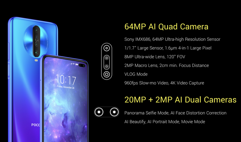 В общей сложности в Poco X2 установлено шесть камер. Четыре из них находятся на задней панели. Основным в этом наборе выступает 64-мегапиксельный сенсор Sony IMX686, который умеет объединять соседние маленькие пиксели в один большой, за счёт чего повышается качество съёмки, в том числе в условиях недостаточной освещённости.