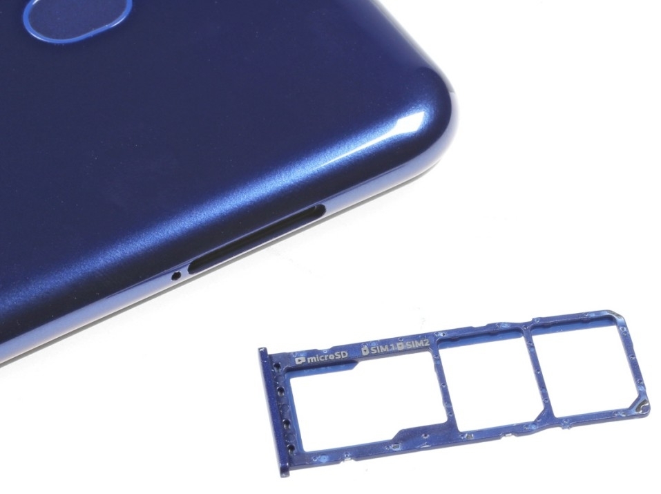 Объём постоянной памяти составляет 16 Гбайт, причём операционная система Android 9.0 Pie с фирменной оболочкой One UI и всеми предустановленными с завода приложениями занимает чуть ли не половину встроенного накопителя, оставляя для пользовательских программ и файлов немногим более 9 Гбайт. К счастью, поддерживаются карты памяти microSD вместимостью до 512 Гбайт, причём слот для них сделан отдельным, поэтому для расширения хранилища жертвовать второй SIM-картой не придётся.