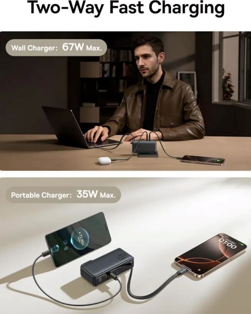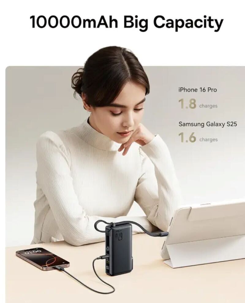 • Наявність виходів Type-C, USB та вбудованого кабелю Type-C розширює сумісність із різними моделями техніки та аксесуарів;