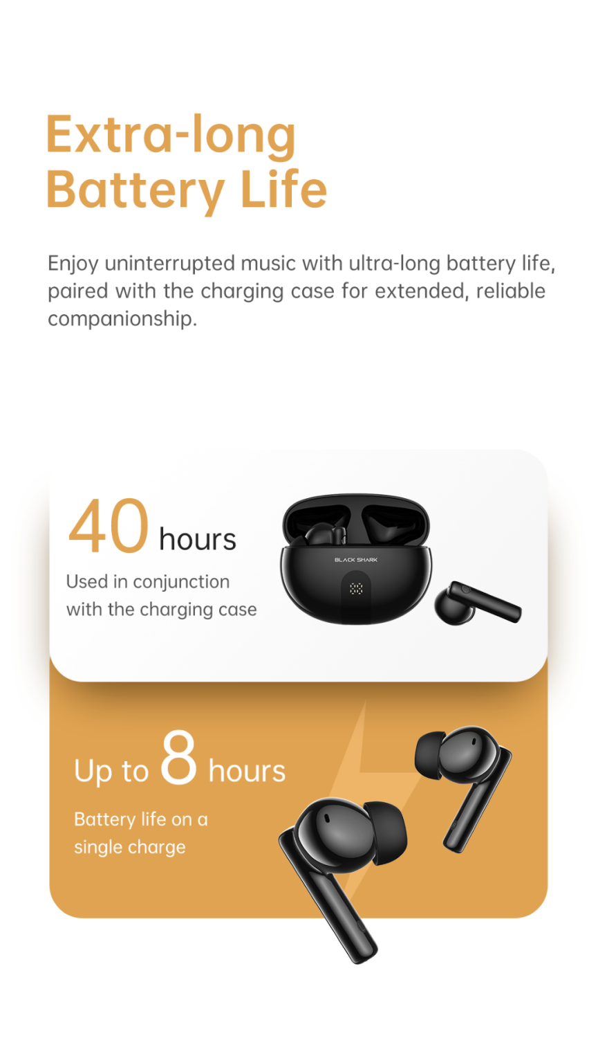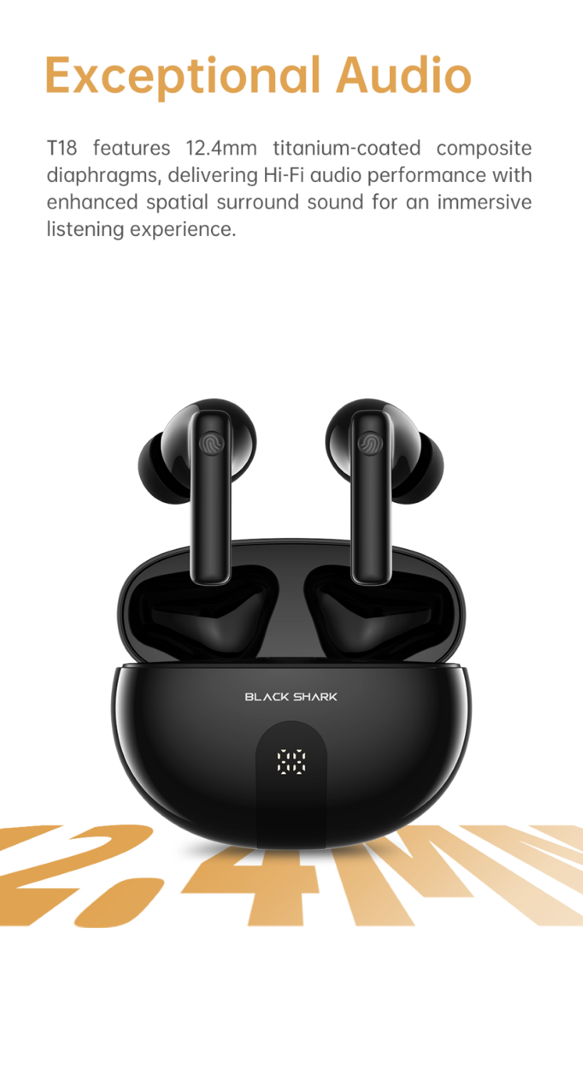 Бездротові навушники Black Shark T18 (BS-T18) – це сучасна TWS-гарнітура для тих, хто цінує потужний звук, комфорт та свободу рухів. Вакуумна внутрішньоканальна конструкція забезпечує щільну посадку і допомагає краще ізолювати зовнішній шум, а активне шумозаглушення до 45 дБ робить прослуховування музики та ігор максимально занурюючим. Навушники підтримують Hi-Fi якість звучання, передаючи глибокі баси та чисті високі частоти. Вбудована індикація заряду дозволяє завжди контролювати рівень батареї, а автономність до 40 годин дозволяє користуватися навушниками кілька днів без підзарядки. Захист IP54 допомагає не перейматися пилом і бризками води в повсякденному житті.
