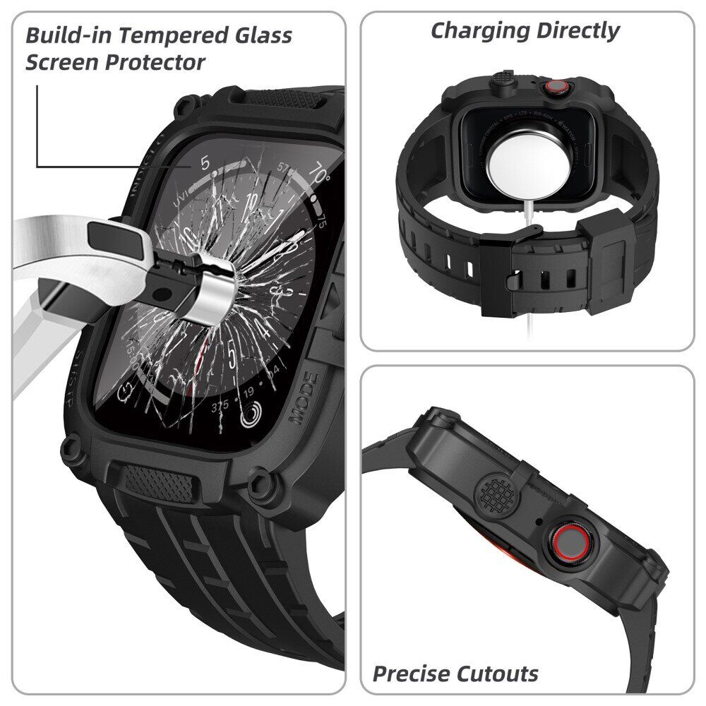 Ремінець Deexe Rugged Strap для Apple Watch 44 mm / SE 44 mm – створений для активних користувачів, що захоплюються екстремальними розвагами, походами, а також для тих, хто працює у важких умовах або просто хоче підкреслити у своєму образі мужність і готовність до будь-яких випробувань. Ремінець виконаний із високоякісного силікону, який забезпечує комфортне носіння протягом усього дня. Рамка годинника, виготовлена ​​з міцного полікарбонату, забезпечує виняткову зносостійкість, тоді як загартоване скло надійно захищає дисплей від подряпин. Точні вирізи гарантують збереження функціоналу годинника, тоді як безліч отворів на ремінці роблять його зручним для регулювання на зап'ясті будь-якої товщини.
