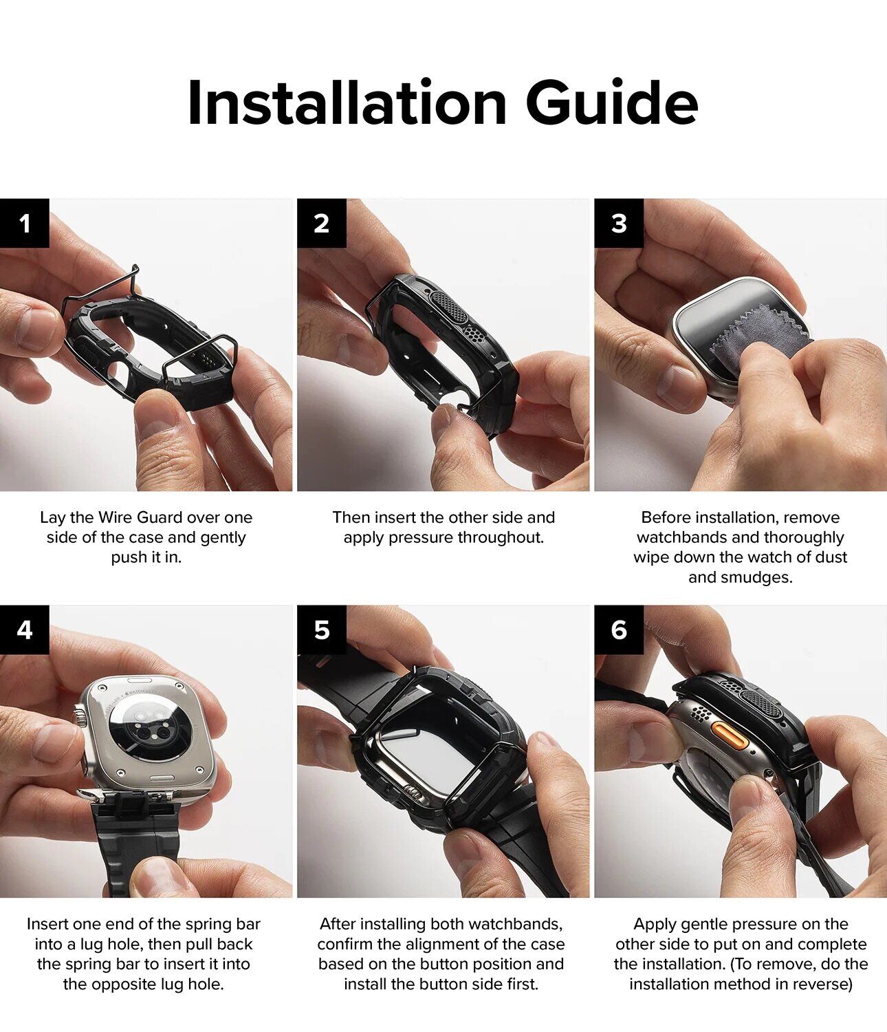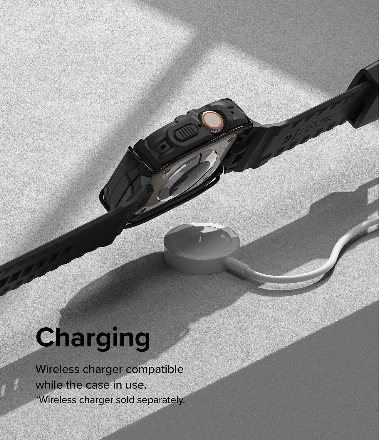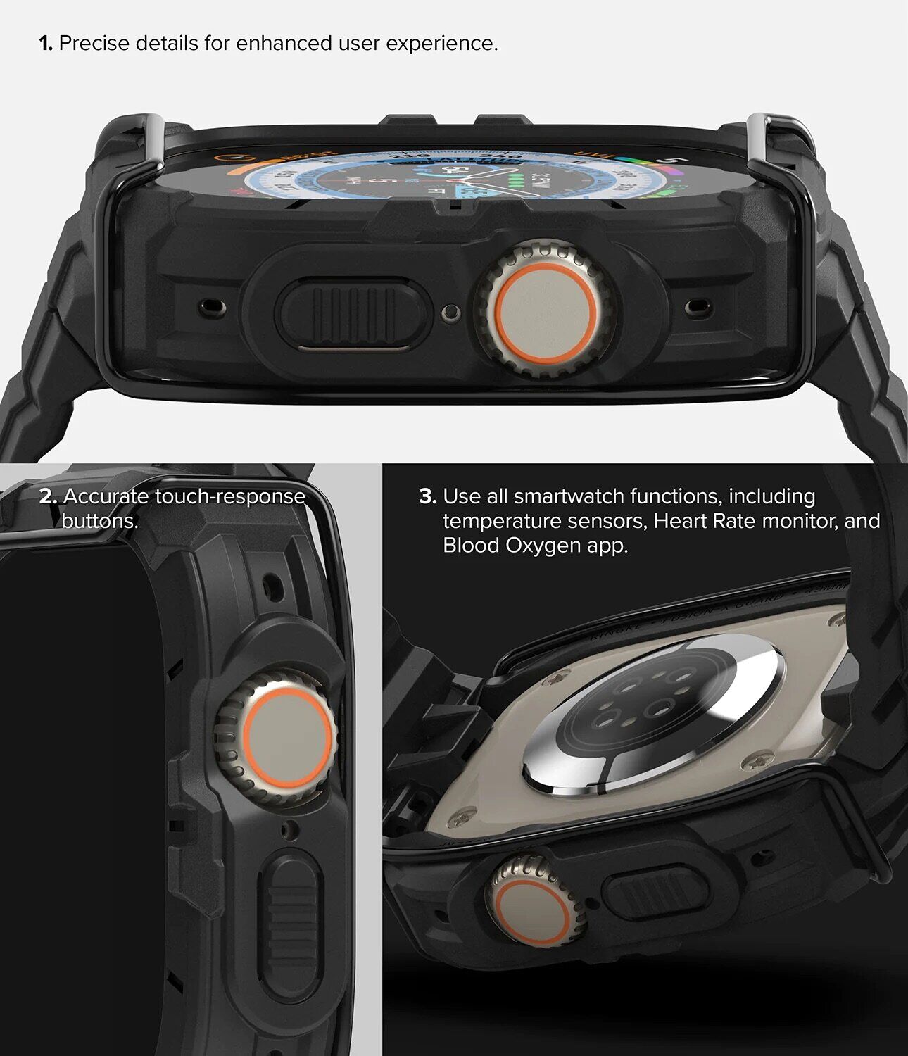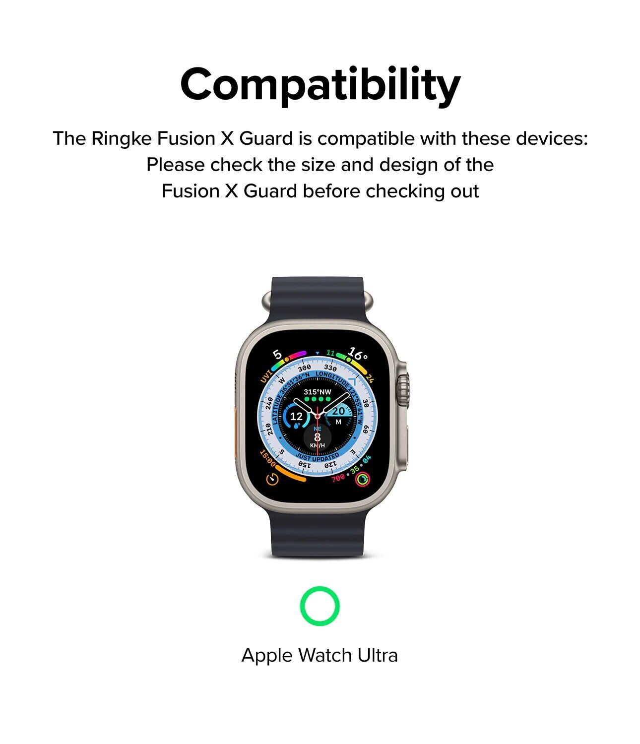 Ремінець RINGKE Fusion X Guard для Apple Watch Ultra / Ultra 2 / Ultra 3 (49mm) являє собою стильний ремінець, з'єднаний з високоміцним чохлом. Зроблені в єдиному стилі, вони мають солідний зовнішній вигляд, а грубі лінії в дизайні чудово доповнять спортивний образ. Чохол поєднує у складі гнучкий силікон та міцний полікарбонат, завдяки чому забезпечує високий рівень захисту від механічних пошкоджень. Додатково посилений металевою рамкою.