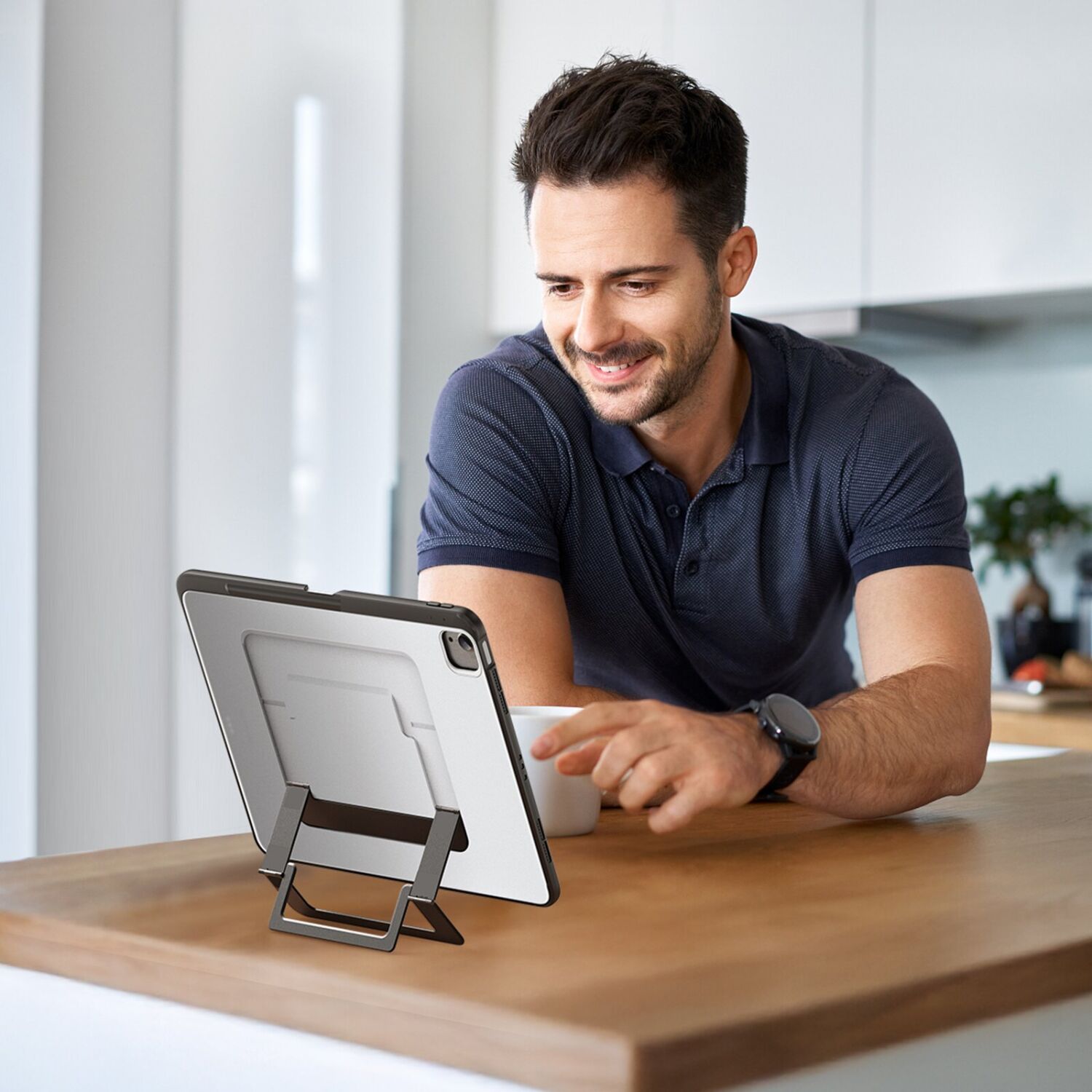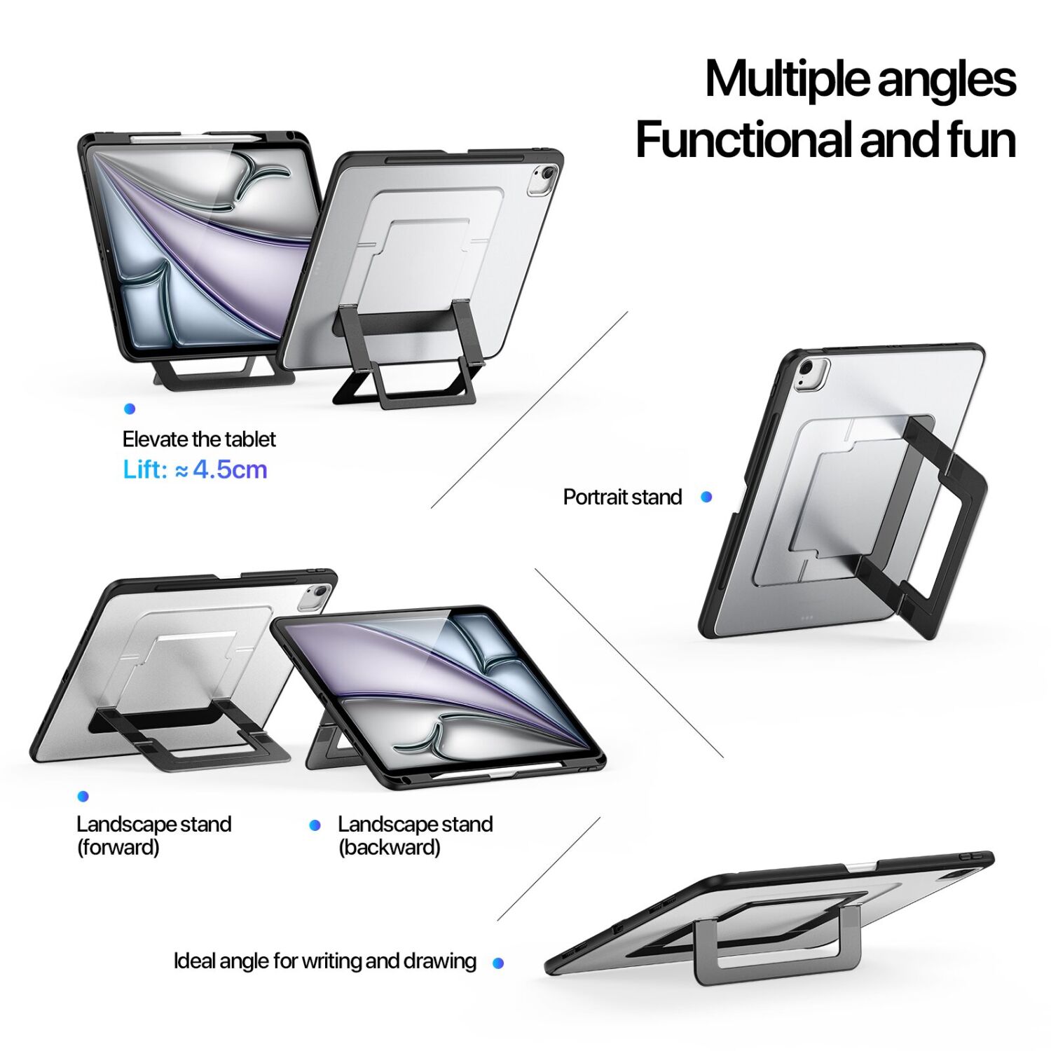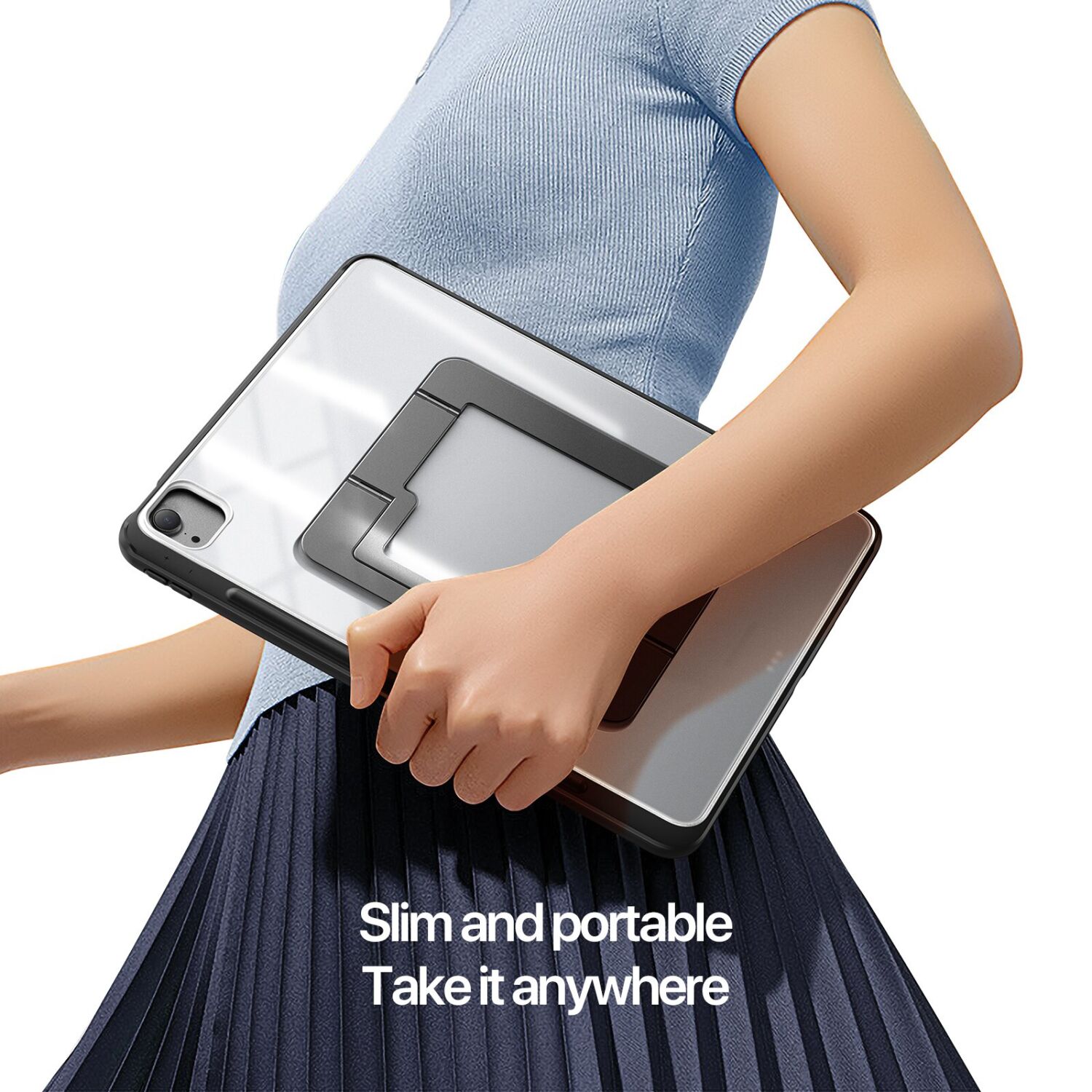 DUX DUCIS Axis Series для iPad Air 13 M3/M2 (2025/2024) розроблений для комфортного використання планшета в роботі, навчанні та повсякденних домашніх завданнях. Конструкція виконана з поєднання еластичної рамки TPU і задньої панелі з полікарбонату з матовою поверхнею, що допомагає знизити ймовірність появи подряпин та інших слідів повсякденної експлуатації. Модель підтримує кілька варіантів установки пристрою, включаючи підняте положення висотою близько 4,5 см для перегляду контенту, кут близько 25° для письма і малювання, а також горизонтальну і вертикальну орієнтацію екрана. Підвищені краї та посилені кути розраховані на зменшення наслідків випадкових падінь і ударів при щоденному використанні. Матова обробка задньої панелі робить відбитки та сліди від вологи менш помітними, спрощуючи догляд за поверхнею. Корпус точно повторює форму планшета і не обмежує доступ до його основних функцій. Передбачені акуратні вирізи для камери, динаміків і роз'ємів, а також окремі накладки на клавіші, що підтримують стабільну роботу кнопок. Тонкий профіль зберігає компактність пристрою і зручність перенесення без істотного збільшення габаритів.