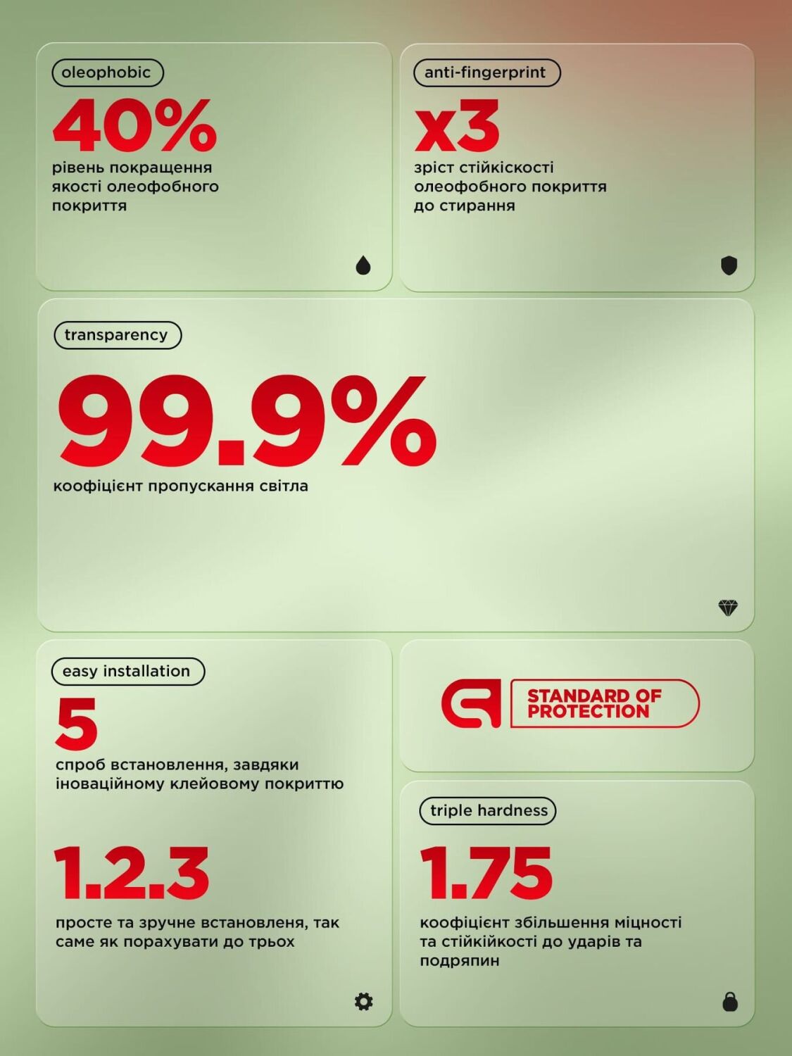 • Олеофобний шар захищає від відбитків, жиру та полегшує догляд за екраном;