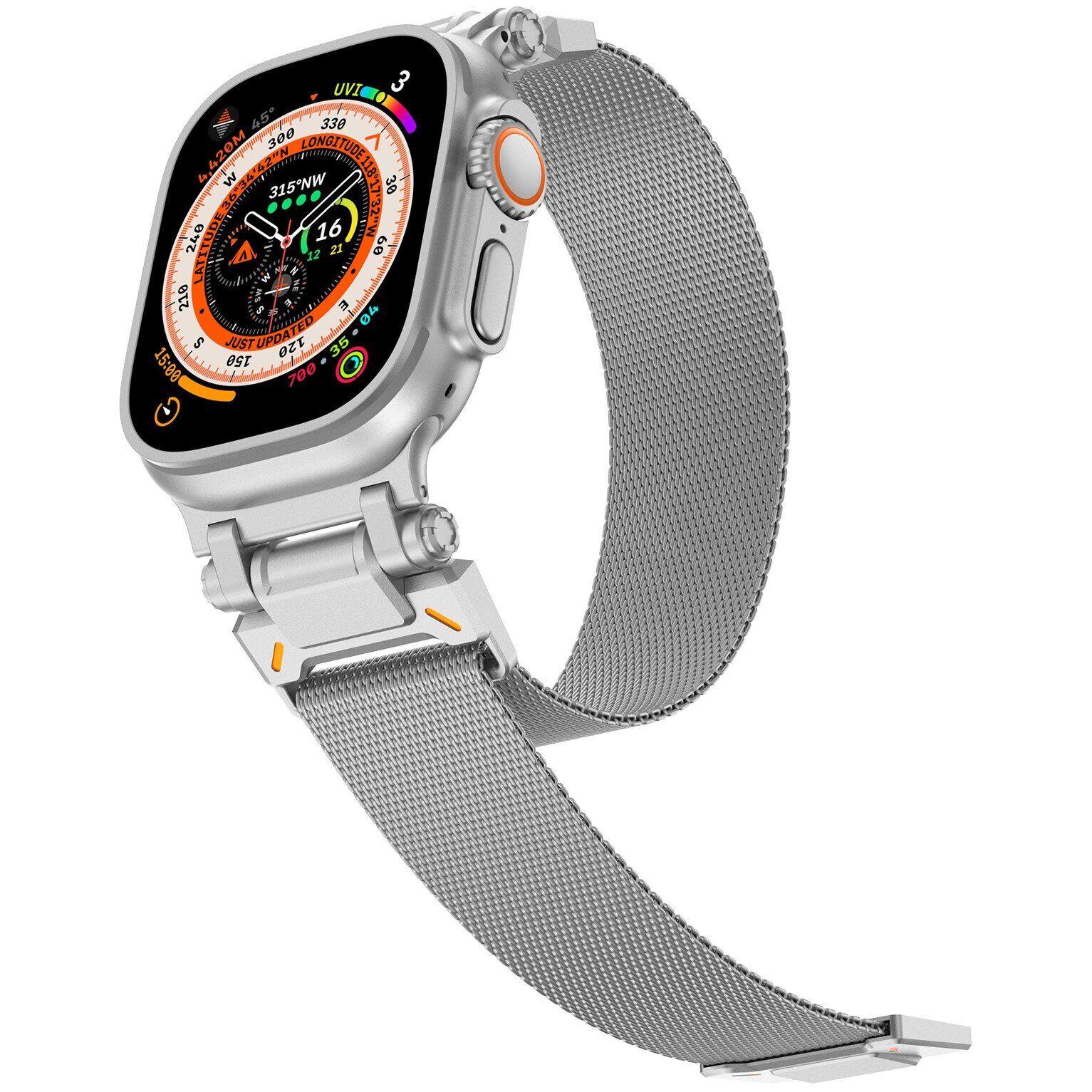 Ремінець Deexe Milanese Design розроблений спеціально для розумних годинників Apple Watch 46 / 45 / 44 / SE 44 / 42 (Series 1-3) / Ultra / Ultra 2 / Ultra 3, забезпечуючи комфортну посадку і надійну фіксацію на зап'ясті. Завдяки магнітній застібці ви можете швидко підігнати довжину під свій розмір, що робить аксесуар зручним у повсякденному використанні. Універсальний розмір підходить для зап'ясть різного розміру, що робить ремінець придатним для більшості користувачів. Модель виготовлено з неіржавкої сталі високої якості, стійкої до корозії та зносу, а плетена структура забезпечує циркуляцію повітря, запобігаючи перегріванню шкіри та даючи змогу носити аксесуар протягом усього дня. Елегантний міланський дизайн робить ремінець актуальним як для ділового одягу, так і для повсякденних виходів. Аксесуар легко встановлюється і знімається, що зручно при заміні старого ремінця.
