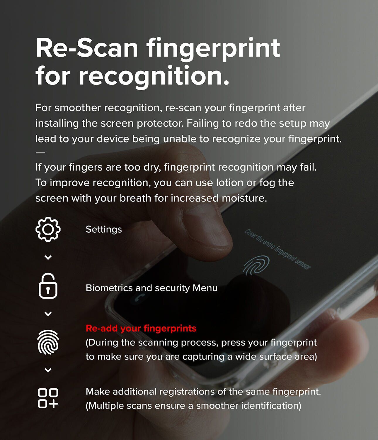 • Зверніть увагу: у смартфонах з підекранним сканером пальця стекла можуть знижувати його чутливість, в окремих випадках сканер може не працювати взагалі.