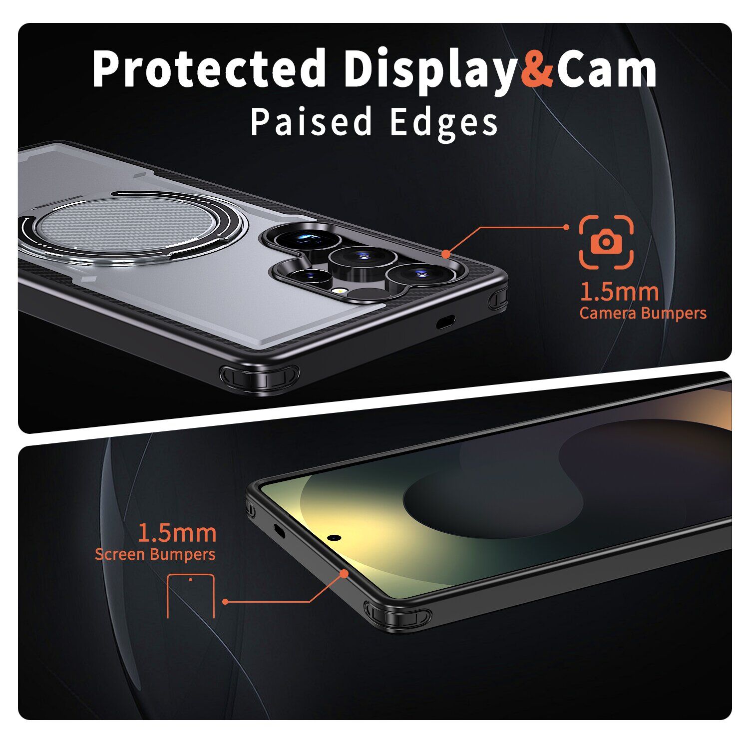 Захисний чохол Reframe Grip MagSafe для Samsung Galaxy S25 Ultra (S938) розроблений для щоденного використання смартфона з урахуванням особливостей його конструкції. Модель виготовлена з комбінації TPU і PC, що дозволяє зберегти баланс між гнучкістю і жорсткістю корпусу, а посилені кути допомагають знизити вплив ударів при випадкових падіннях і повсякденних навантаженнях. Вбудоване магнітне кільце забезпечує сумісність із зарядними пристроями та аксесуарами стандарту MagSafe без необхідності знімати аксесуар. В області камери передбачений піднятий бортик висотою близько 1,5 мм, який знижує контакт лінз з поверхнями при розміщенні смартфона. Металеве кільце з можливістю обертання на 360° виконує функцію підставки та дозволяє вибирати зручний кут огляду. Конструкція точно повторює форму корпусу пристрою та оснащена акуратними вирізами для роз'ємів і динаміків, а кнопки управління закриті накладками, які зберігають звичну чуйність при натисканні.