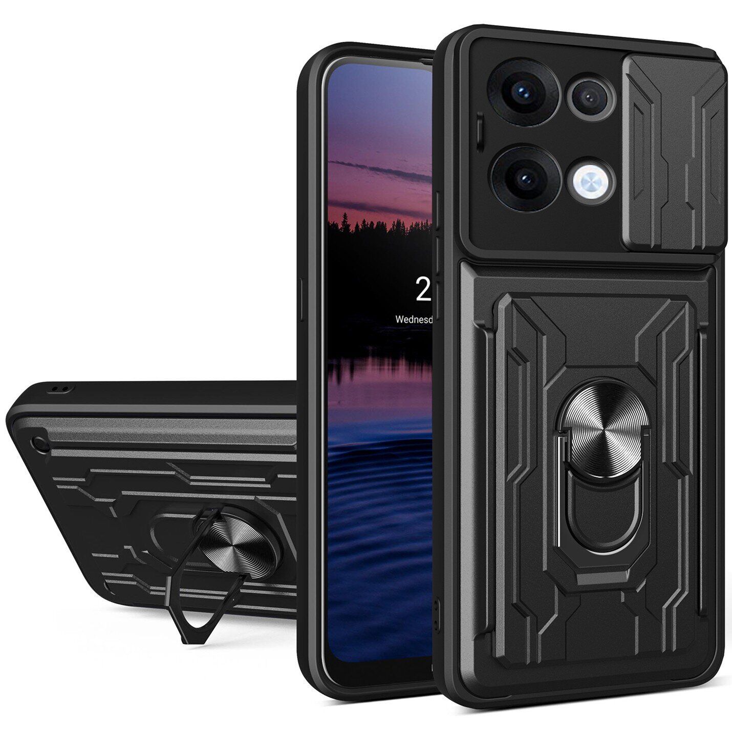 Deexe Armor Slider – це чохол підвищеної міцності, що гарантує OPPO Reno 13 5G безпеку навіть при жорстких ударах і падіннях на підлогу. В основі тут лежить двоскладове компонування з еластичної силіконової (TPU) накладки та жорсткого полікарбонатного панцира, що забезпечує "протиударний" ефект. Чохол ефектно виглядає, а його текстурована поверхня приємна на дотик і не ковзає в долоні. Конструкція враховує розміщення камери та функціональних роз'ємів, для яких передбачені вирізи, а також апаратних клавіш, що покриваються м'якими дублікаторами. Для захисту камери передбачена спеціальна рухома шторка, яка прикриватиме тендітний об'єктив на той час, поки ви її не потребуєте. Додатково на спинці розміщений металевий елемент з кільцем-підставкою, що дозволяє як фіксувати пристрій на магнітній панелі автомобільного тримача, без необхідності клеїти магнітну наклейку, так і, відкинувши кільце назад, зручно оперти на нього смартфон під час перегляду відео або читання з екрану.