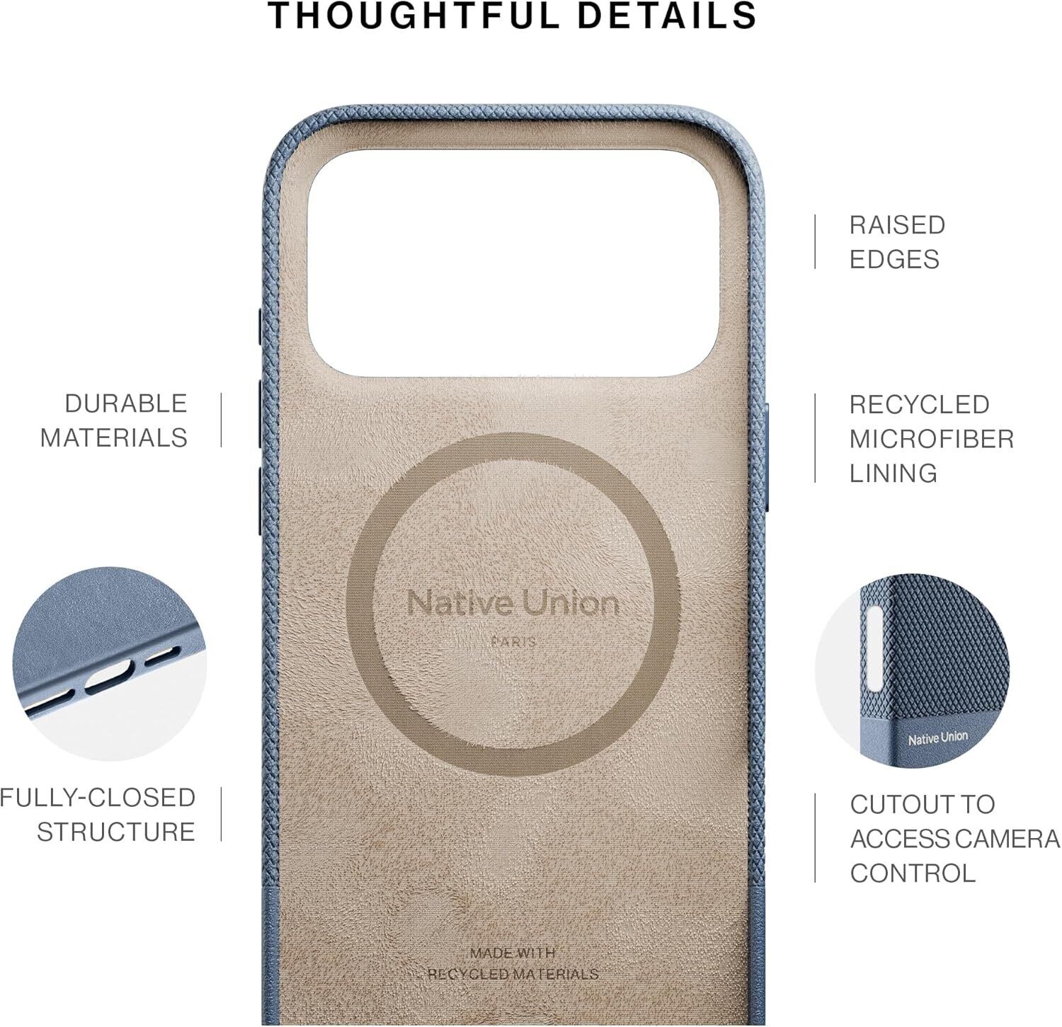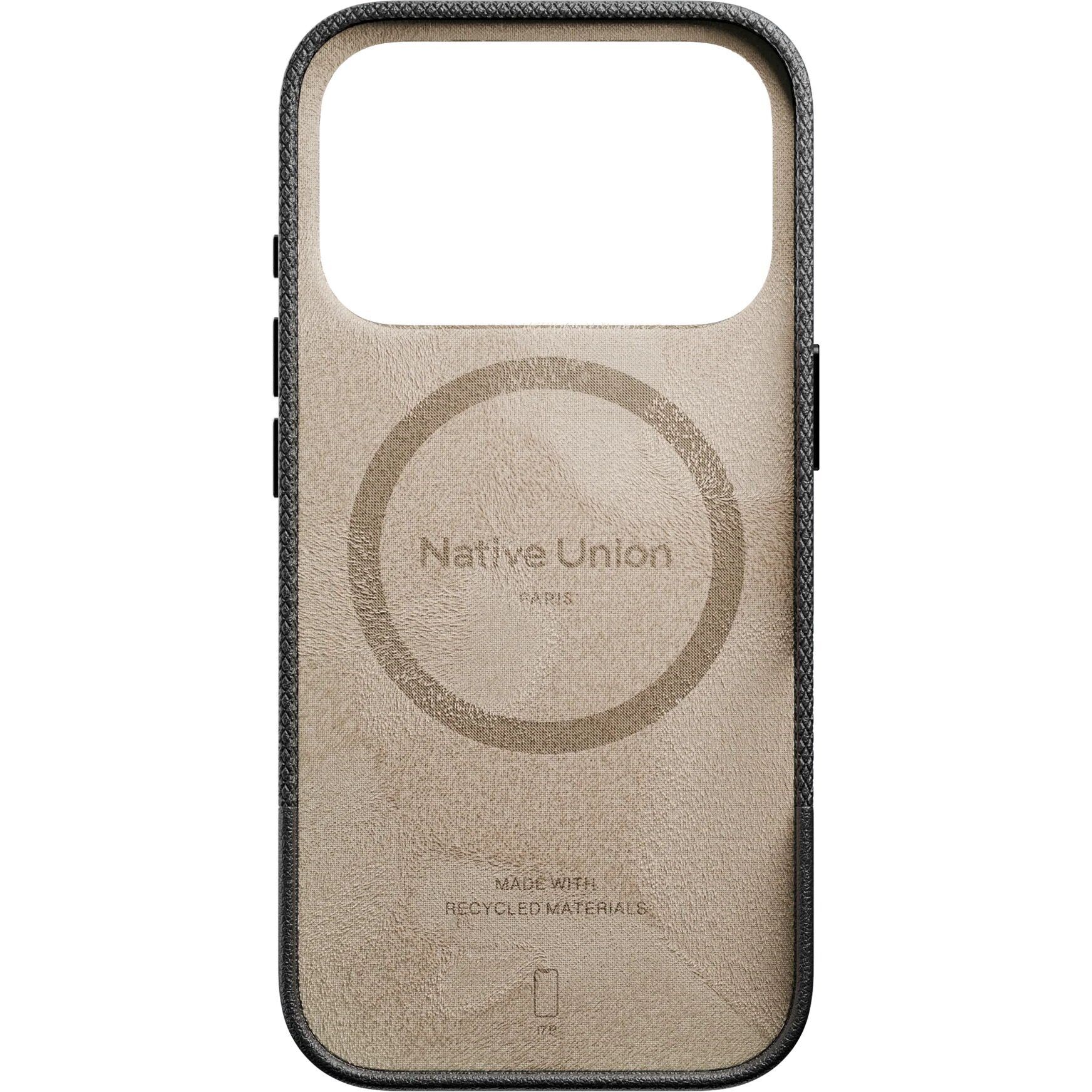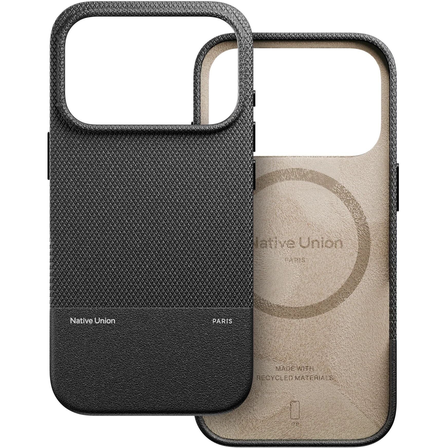 Захисний чохол Native Union (RE) Classic для iPhone 17 Pro — це стильний аксесуар з акцентом на преміальну фактуру і надійний захист на кожен день. Модель виконана в елегантному дизайні з гладкою поверхнею і перехресною текстурою, завдяки чому чохол виглядає дорого і приємно відчувається в руці. В основі конструкції — рамка з 100% переробленого полікарбонату, повністю обтягнута матеріалом, який є екологічною альтернативою шкірі і не містить компонентів тваринного походження, зберігаючи при цьому міцність і зносостійкість. Оновлена версія (RE) Classic пройшла додаткові тестування і отримала поліпшену довговічність, щоб впевнено захищати смартфон від повсякденних ударів і подряпин. Вбудовані магніти забезпечують повну сумісність з MagSafe-аксесуарами і стабільну фіксацію для швидкої зарядки. Закрита нижня частина, посилена конструкція і підняті краї допомагають знизити ризик пошкоджень при падіннях — чохол розрахований на захист при падінні з висоти до 1,8 м.