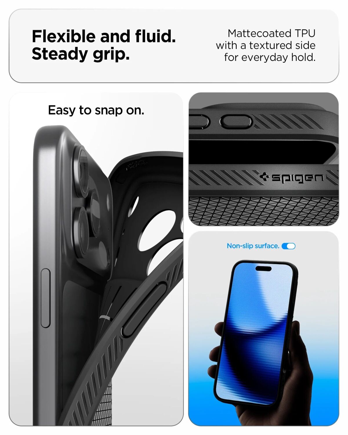 Протиударний чохол Spigen SGP Liquid Air для Apple iPhone 17 Pro ідеально поєднує в собі захист і стильний дизайн. Він виготовлений з термопластичного поліуретану і прикрашений трикутним гравіюванням, яке покращує зчеплення і сприяє кращій амортизації ударів. Чохол відповідає військовим стандартам захисту MIL-STD і витримує падіння з висоти до 1,2 метра. Попри свою міцність, він залишається напрочуд тонким, збільшуючи габарити телефона лише на 0,9 мм і надаючи додатковий захист для екрана завдяки невеликій виступаючій рамці.