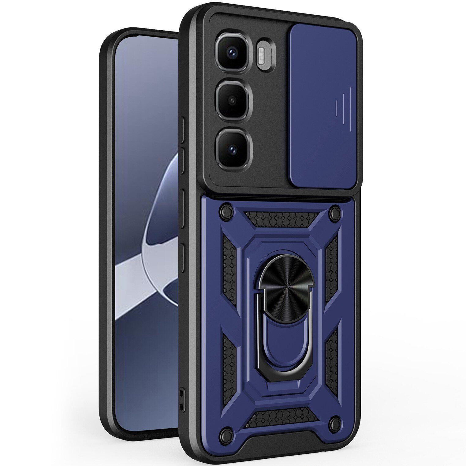 Чохол Deexe Armor Shield – це безкомпромісний захист вашого Infinix Hot 60 Pro від самих різних пошкоджень, що загрожують йому в процесі активного використання. В його основі лежить двокомпонентна структура з еластичної силіконової (TPU) накладки та міцного пластикового панцира: панцир приймає на себе основну силу удару у випадку падіння на підлогу, тоді як еластичний силікон розсіює залишкову енергію, мінімізуючи негативний вплив на смартфон. В чохлі передбачені всі необхідні отвори для вільного доступу до портів і камери, а також м'які дублікатори клавіш, що оберігають їх від забивання брудом. Для захисту камери додатково передбачена рухлива шторка, яка буде прикривати об'єктив, коли ви нею не користуєтеся. Також слід зазначити наявність металевого елемента з кільцем-тримачем на спинці, який може виконувати відразу три зручні функції: перш за все, надівши кільце на палець, можна впевнено утримувати пристрій в руці, не побоюючись випадково його впустити; по-друге, якщо відкинути кільце назад, вийде зручна підставка, яка полегшує перегляд відео або читання з екрана; ну і по-третє, металева основа кільця дозволяє вільно фіксувати пристрій на магнітній панелі автомобільного утримувача, без необхідності наносити спеціальну наклейку.