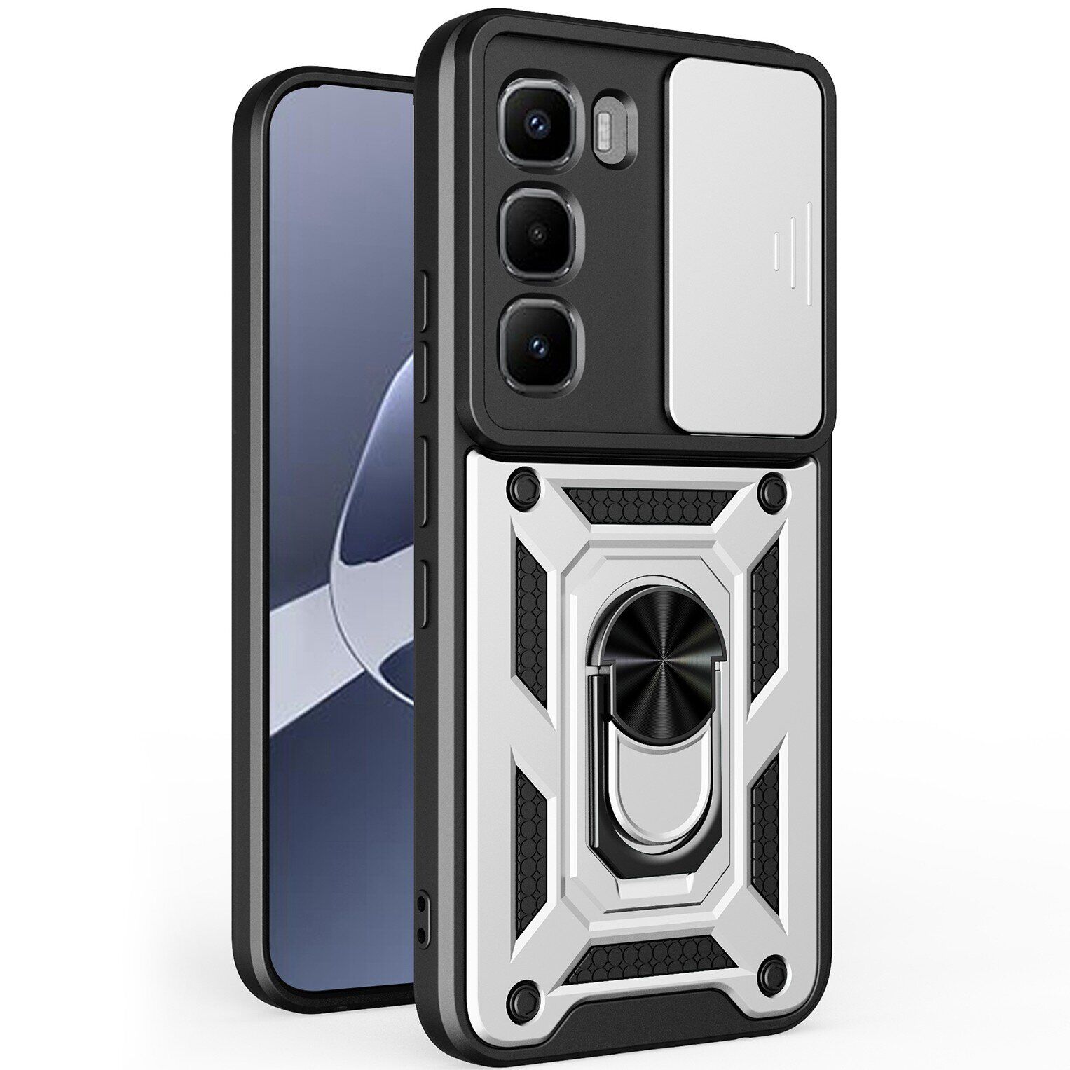 Чохол Deexe Armor Shield – це безкомпромісний захист вашого Infinix Hot 60 Pro від самих різних пошкоджень, що загрожують йому в процесі активного використання. В його основі лежить двокомпонентна структура з еластичної силіконової (TPU) накладки та міцного пластикового панцира: панцир приймає на себе основну силу удару у випадку падіння на підлогу, тоді як еластичний силікон розсіює залишкову енергію, мінімізуючи негативний вплив на смартфон. В чохлі передбачені всі необхідні отвори для вільного доступу до портів і камери, а також м'які дублікатори клавіш, що оберігають їх від забивання брудом. Для захисту камери додатково передбачена рухлива шторка, яка буде прикривати об'єктив, коли ви нею не користуєтеся. Також слід зазначити наявність металевого елемента з кільцем-тримачем на спинці, який може виконувати відразу три зручні функції: перш за все, надівши кільце на палець, можна впевнено утримувати пристрій в руці, не побоюючись випадково його впустити; по-друге, якщо відкинути кільце назад, вийде зручна підставка, яка полегшує перегляд відео або читання з екрана; ну і по-третє, металева основа кільця дозволяє вільно фіксувати пристрій на магнітній панелі автомобільного утримувача, без необхідності наносити спеціальну наклейку.