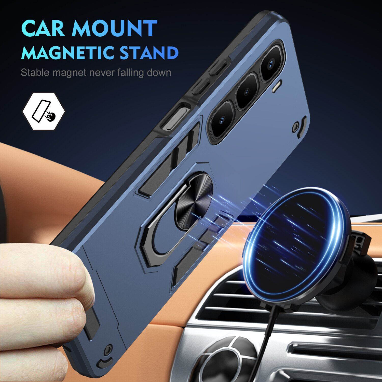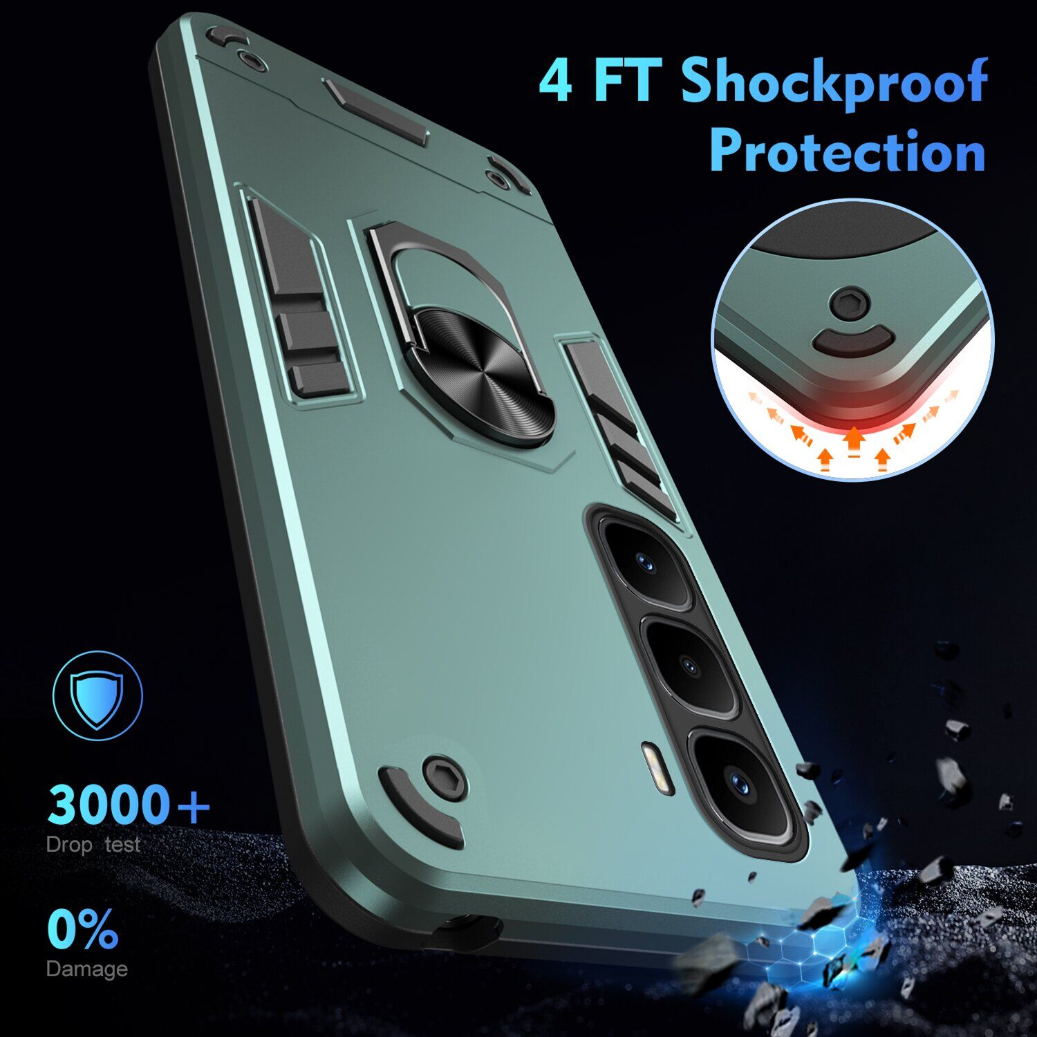 Deexe Hybrid Shell – це чохол з підвищеними захисними характеристиками, покликаний забезпечити повну безпеку корпусу Infinix Hot 60 Pro Plus в процесі щоденного використання. В його основі лежить двоскладове компонування з міцного пластику і еластичного силікону (TPU). Поєднання двох матеріалів різної жорсткості істотно підвищує амортизаційні властивості виробу та дозволяє без проблем справлятися не тільки з подряпинами і потертостями, але навіть тріщинами і сколами, пом'якшуючи силу удару при падінні на підлогу. Шорстка фактура зовнішнього покриття не збирає на собі відбитки пальців, а рифлені елементи на спинці ще й покращують хват у руці. Важливим елементом конструкції є спеціальне кільце на спинці, здатне виконувати відразу кілька корисних завдань: по-перше, в кільце можна просунути палець, щоб впевненіше тримати смартфон в руці; по-друге, відкинувши кільце, його можна використовувати в якості зручної підставки; ну і по-третє, металевий елемент кільця дозволяє вільно фіксувати пристрій на панелі магнітного автомобільного тримача, без необхідності нанесення спеціальної наклейки.