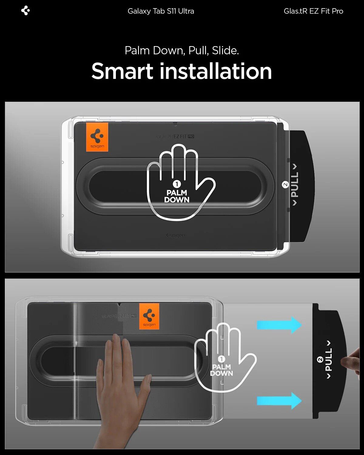 Захисне скло Spigen Screen Protector EZ Fit Glas.tR Pro для Samsung Galaxy Tab S11 Ultra (X930/X936) AGL10200 — це зручне і надійне рішення для захисту екрану без зайвих зусиль при установці. Головна перевага моделі — фірмовий установчий лоток EZ Fit, який автоматично вирівнює скло по дисплею і допомагає приклеїти його рівно з першого разу: достатньо розмістити рамку, натиснути по центру і дочекатися фіксації. Загартоване скло з твердістю 9H ефективно захищає екран від подряпин, потертостей і випадкових пошкоджень у повсякденному використанні, зберігаючи при цьому чіткість зображення і природну чутливість сенсора. Олеофобне покриття зменшує сліди від пальців і полегшує очищення поверхні, а точна форма забезпечує акуратну посадку і сумісність із захисними чохлами, включаючи Spigen Liquid Air. Це відмінний вибір для тих, хто хоче максимальний захист і ідеально рівну установку без досвіду та інструментів.