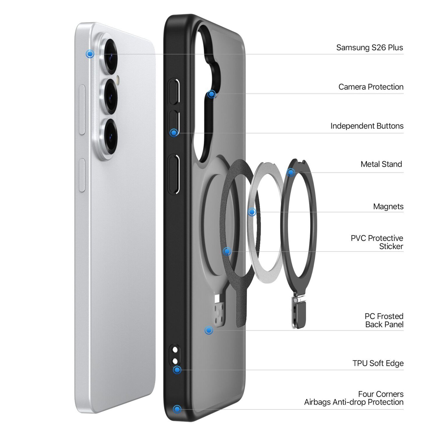 Захисний чохол DUX DUCIS Yind Series Stand для Samsung Galaxy S26 Plus забезпечує надійний захист і комфортне використання вашого пристрою. Чохол виконаний з комбінованих матеріалів: м'які краї з TPU і задня панель з матового полікарбонату, які гарантують зручний хват і довговічність. Аксесуар сумісний з функцією MagSafe завдяки вбудованим 38 потужним магнітам, що забезпечує стабільне та надійне кріплення під час бездротової зарядки. Для додаткового захисту передбачені потовщена задня панель і амортизуючі кути, які ефективно мінімізують ризик пошкоджень від ударів і падінь. Бортики навколо екрана і камери додатково захищають їх від подряпин і потертостей. Кнопки виконані окремо, що забезпечує їх плавну і точну роботу. Матеріал чохла стійкий до відбитків пальців і слідів від поту, зберігаючи акуратним зовнішній вигляд аксесуара. Зручна магнітна підставка з кутом повороту 360° дає змогу комфортно використовувати пристрій у портретній або альбомній орієнтації для перегляду відео або спілкування.