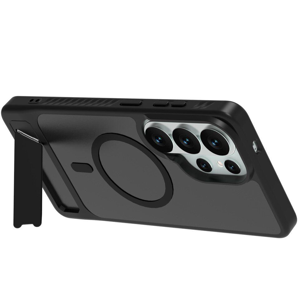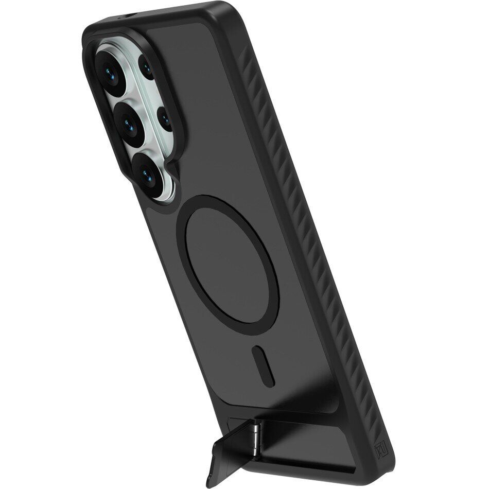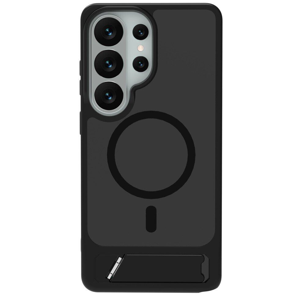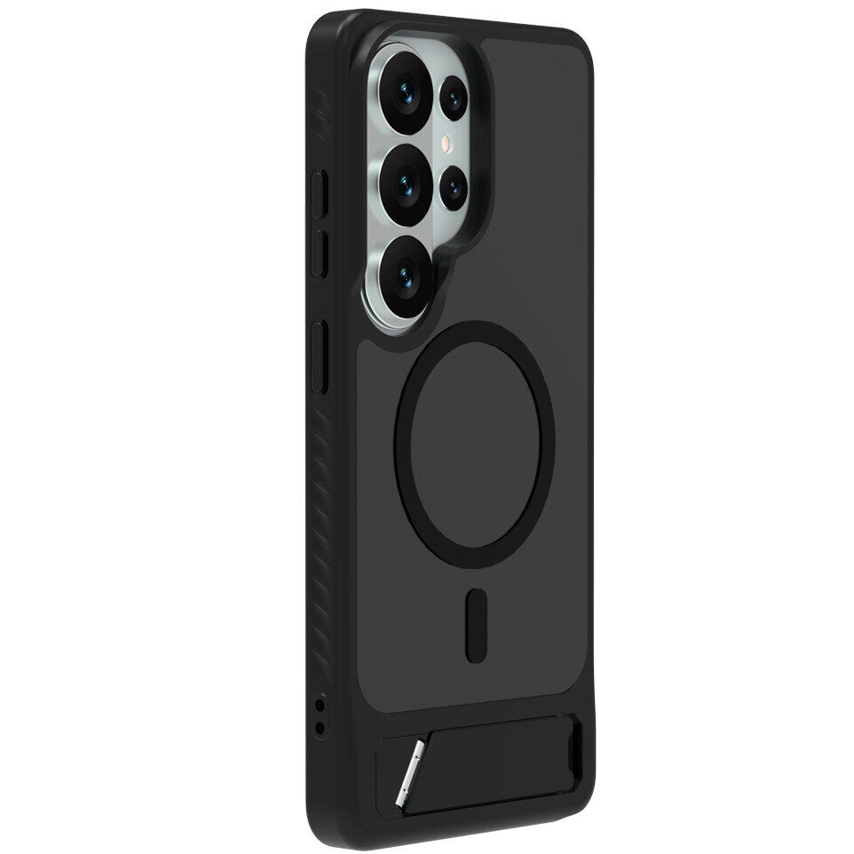 Чохол LEREACH Le-Chic Series для Samsung Galaxy S26 Ultra – функціональний аксесуар, розрахований на щоденне використання та сумісний з екосистемою MagSafe. Основна частина корпусу виконана з міцного полікарбонату, а гнучкі краї виготовлені з еластичного TPU – це поєднання матеріалів різної жорсткості допомагає пом'якшити удари та захистити пристрій від пошкоджень при падіннях. Вбудоване магнітне кільце забезпечує роботу з MagSafe-зарядками, автомобільними тримачами та іншими сумісними аксесуарами. Модель оснащена відкидною металевою підставкою на спинці, котра буде корисною для перегляду фільмів, відеозв'язку та інших завдань без необхідності тримати смартфон в руках. Трохи виступаючі бортики по краях екрану та блоку камер зменшують ризик випадкових подряпин при контакті з поверхнями. Бічні частини корпусу мають текстуровану поверхню, що робить хват більш впевненим і знижує ймовірність випадкового вислизання. У нижній частині передбачено отвір для кріплення ремінця – зручне рішення для тих, хто часто носить смартфон в руці або на зап'ясті (ремінець не входить в комплектацію).