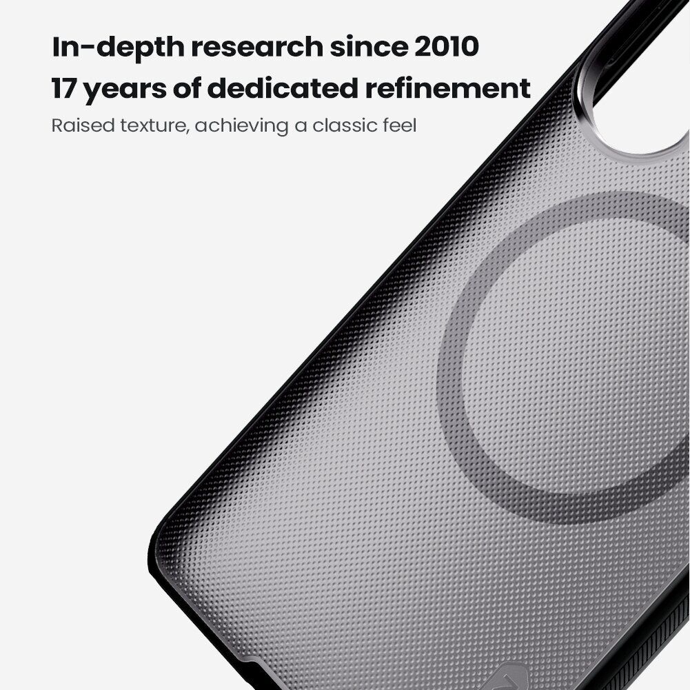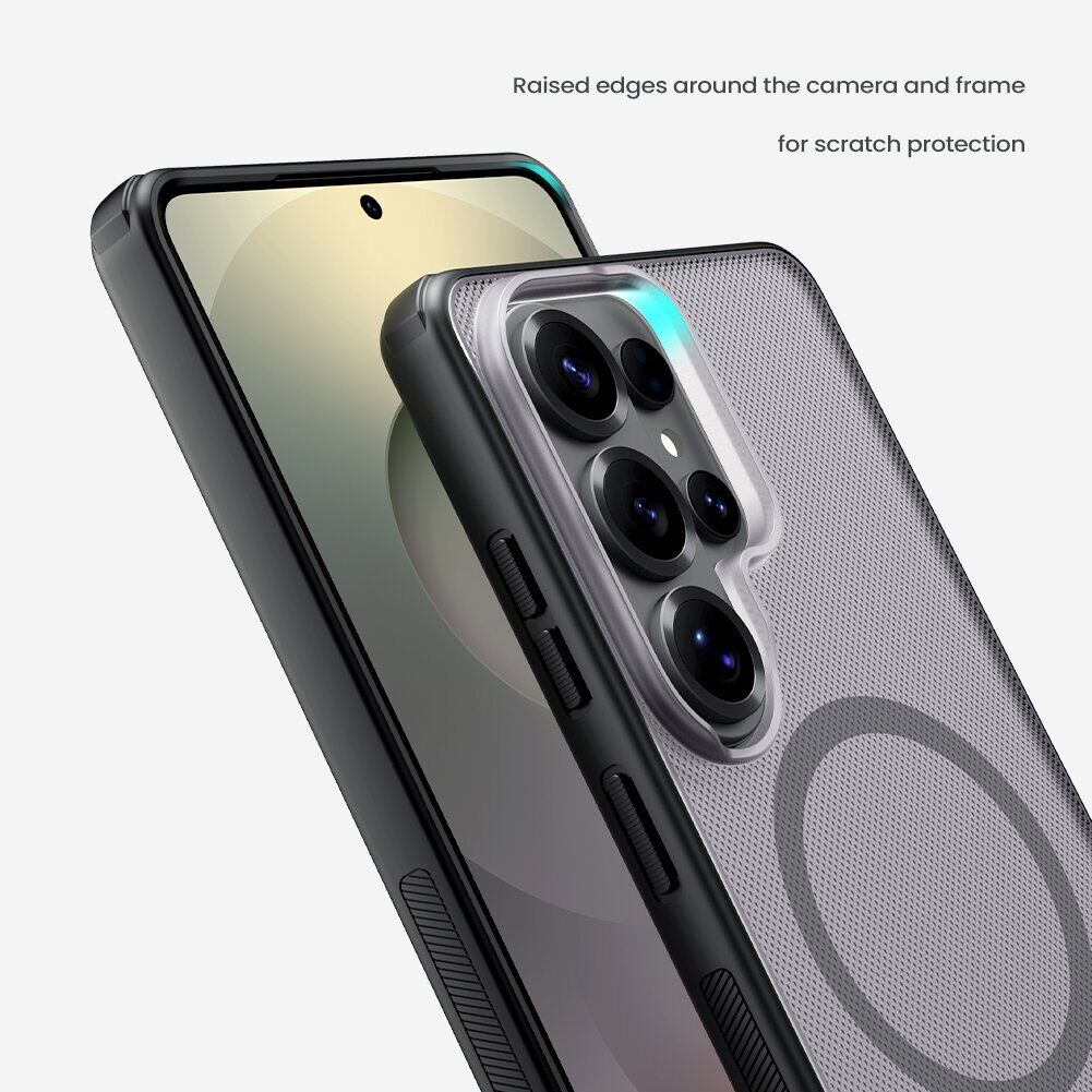 Чохол Super Frosted Shield Pro Magnetic від NILLKIN стане надійним захисним і зручним функціональним доповненням до вашого Samsung Galaxy S26 Ultra. Він виконаний з комбінації двох матеріалів різної жорсткості – міцної полікарбонатної основи та еластичного силіконового (TPU) бампера по периметру, що забезпечує відмінну стійкість до механічних впливів при повсякденному використанні, а також допоможе значно краще пом'якшити удар у випадку падіння на підлогу. Напівпрозора поверхня спинки надає аксесуару оригінальний і незабутній зовнішній вигляд, а її спеціальна фактурна поверхня не збирає відбитки пальців і покращує хват в долоні. Також на ребрах передбачені спеціальні насічки, що додатково знижують ймовірність випадкового вислизання смартфона. Для всіх функціональних роз'ємів в конструкції є необхідні вирізи, для клавіш – м'які пилозахисні дублікатори. В надітому стані чохол буде трохи виступати по периметру лицьової панелі, створюючи невеликий захисний бортик, котрий дозволить безпечно класти смартфон екраном вниз. Ще одна перевага чохла – підтримка технології MagSafe завдяки вбудованому магніту в задню панель: в ньому ви не відчуєте жодних проблем з підключенням до сумісних бездротових ЗУ, а зарядка залишиться такою ж ефективною, як і раніше.
