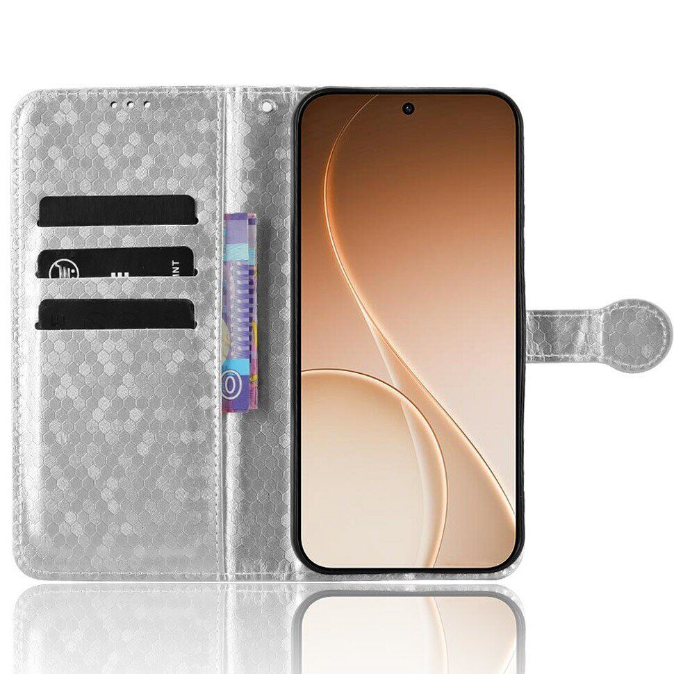 Захисний чохол Deexe Pegasus Cover для OPPO Reno 15 Pro – це не просто аксесуар. Це вираз вашого стилю, функціональності та турботи про ваш смартфон. Зроблений з PU шкіри, він не тільки приємний на дотик, а й довговічний, стійкий до подряпин. М'який TPU-тримач всередині забезпечує ідеальне прилягання до вашого телефону. Обкладинка чохла прикрашена стильним візерунком у вигляді невеликих ромбів. Усередині є відсіки для карток та бічна кишеня для ваших дрібниць. І як бонус, чохол можна скласти у підставку для зручного перегляду відео. У комплекті також постачається зручний ремінець.