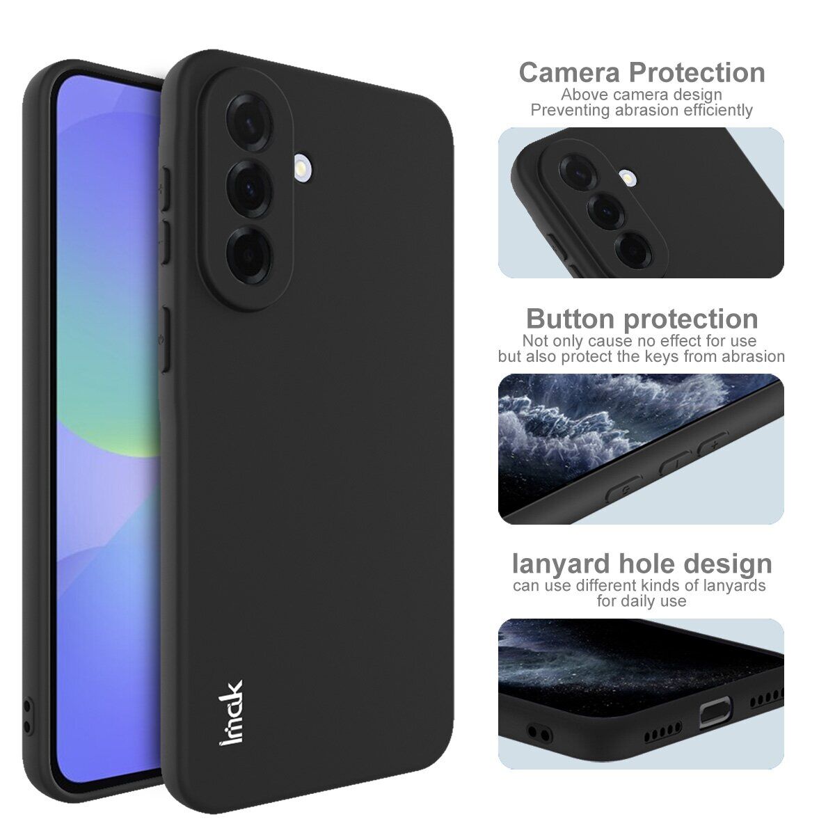 Чохол-накладка IMAK UC-3 Series для Samsung Galaxy A57 (A576) поєднує ультратонкий профіль і мінімалістичний дизайн, максимально зберігаючи початкові розміри та вагу пристрою. Виготовлений з м'якого термополіуретану з "пісочною" текстурою, який забезпечує впевнене утримання і захист від відбитків. Дизайн чохла враховує всі конструктивні особливості пристрою, включно з точними вирізами для портів і камери, а також накладками для кнопок, що захищають від бруду і пилу.