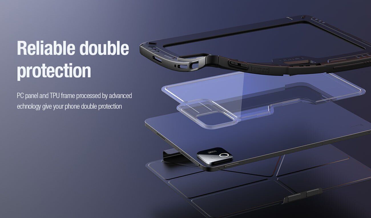 NILLKIN Bumper Leather Case Pro – це надзахищений чохол-книжка, здатний забезпечити збереження поверхонь Xiaomi Pad 8 / Pad 8 Pro навіть у найекстремальніших умовах. Його конструкція складається з двох компонентів: основи-тримача та зовнішньої обкладинки. Основа-тримач виконана з комбінації еластичного силіконового бампера та жорсткої полікарбонатної спинки, що разом забезпечують відмінну амортизацію ударів. На кутах чохла є особливі посилення, т.зв. "повітряні подушки", які забезпечать додатковий захист при найнебезпечніших видах падінь – "ребром" або на кут. Обкладинка виконана з текстурованого поліуретану, спеціальна фактура поверхні якого не збирає на собі відбитки та інші сліди. Для безперешкодного доступу до роз'ємів планшета є спеціальні вирізи, клавіші ж будуть прикриті м'якими, чутливими до натискання дублікаторами. Крім того, для камери передбачена спеціальна захисна заслінка, якою можна прикрити об'єктив на той час, коли ви нею не користуєтеся. Для фіксації в закритому положенні вбудований магніт, а в разі необхідності, верхню кришку можна перетворити на зручну підставку для перегляду відео з двома доступними кутами нахилу.